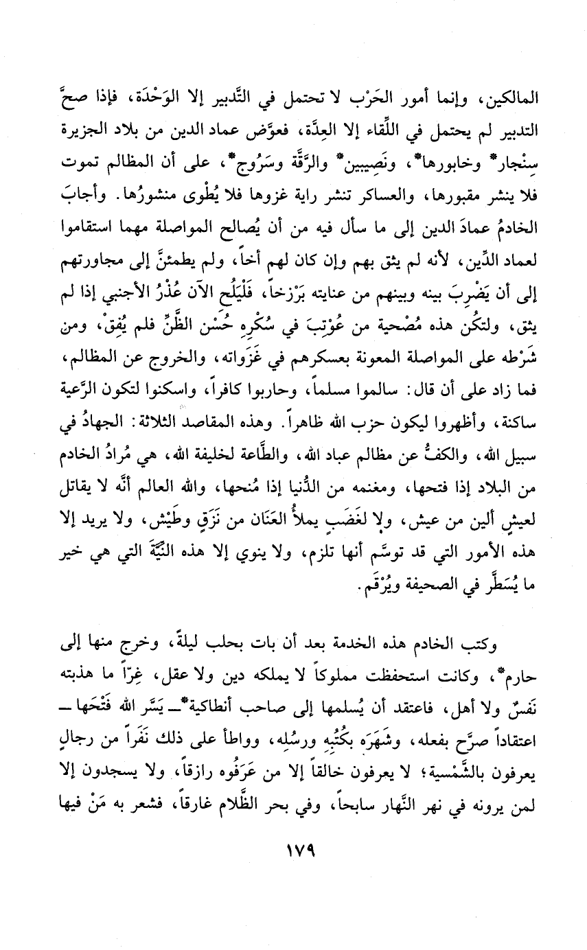 المالكين وَإِنَّمَا أُمُور الْحَرْب لَا تحْتَمل فِي التَّدْبِير إِلَّا الْوحدَة فَإِذا صَحَّ التَّدْبِير لم يحْتَمل فِي اللِّقَاء إِلَّا الْعدة فعوض عماد الدّين من بِلَاد الجزيرة سنجار وخابورها ونصيبين والرقة وسروج على أَن الْمَظَالِم تَمُوت فَلَا ينشر مقبورها والعساكر تنشر راية غزوها فَلَا يطوى منشورها