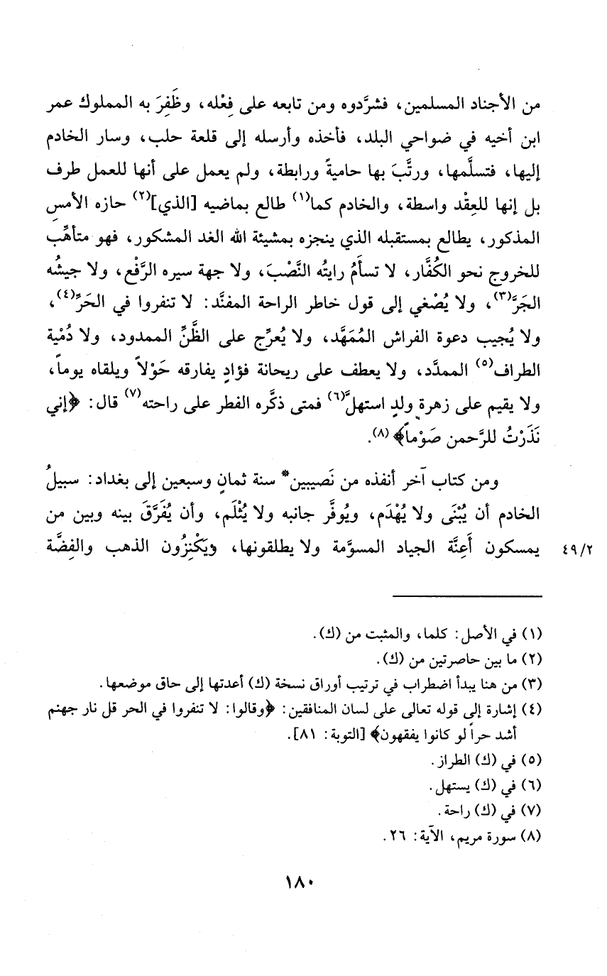 وَمن كتاب آخر أنفذه من نَصِيبين سنة ثَمَان وَسبعين إِلَى بَغْدَاد سَبِيل الْخَادِم أَن يبْنى وَلَا يهدم ويوفر جَانِبه وَلَا يثلم وَأَن يفرق بَينه وَبَين من يمسكون أَعِنَّة الْجِيَاد المسومة وَلَا يطلقونها ويكنزون الذَّهَب وَالْفِضَّة