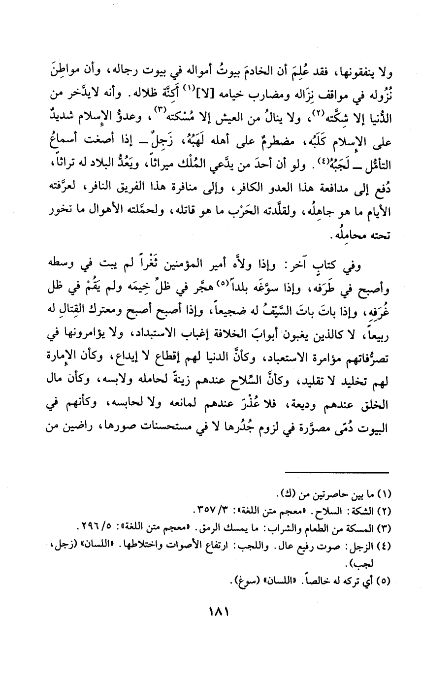 وَفِي كتاب آخر وَإِذا ولاه أَمِير الْمُؤمنِينَ ثغرا لم يبت فِي وَسطه وَأصْبح فِي طرفه وَإِذا سوغه بَلَدا هجر فِي ظلّ خيمه وَلم يقم فِي ظلّ غرفه وَإِذا بَات بَات السَّيْف لَهُ ضجيعا وَإِذا أصبح أصبح ومعترك الْقِتَال لَهُ ربيعا لَا كَالَّذِين يغبون أَبْوَاب الْخلَافَة إغباب الاستبداد وَلَا يؤامرونها فِي تصرفاتهم مُؤَامَرَة الاستعباد وَكَأن الدُّنْيَا لَهُم إقطاع لَا إِيدَاع وَكَأن الْإِمَارَة لَهُم تخليد لَا تَقْلِيد وَكَأن السِّلَاح عِنْدهم زِينَة لحامله ولابسه وَكَأن مَال الْخلق عِنْدهم وَدِيعَة فَلَا عذر عِنْدهم لمانعه وَلَا لحابسه وَكَأَنَّهُم فِي الْبيُوت دمى مصورة فِي لُزُوم جدرها لَا فِي مستحسنات صورها راضين من