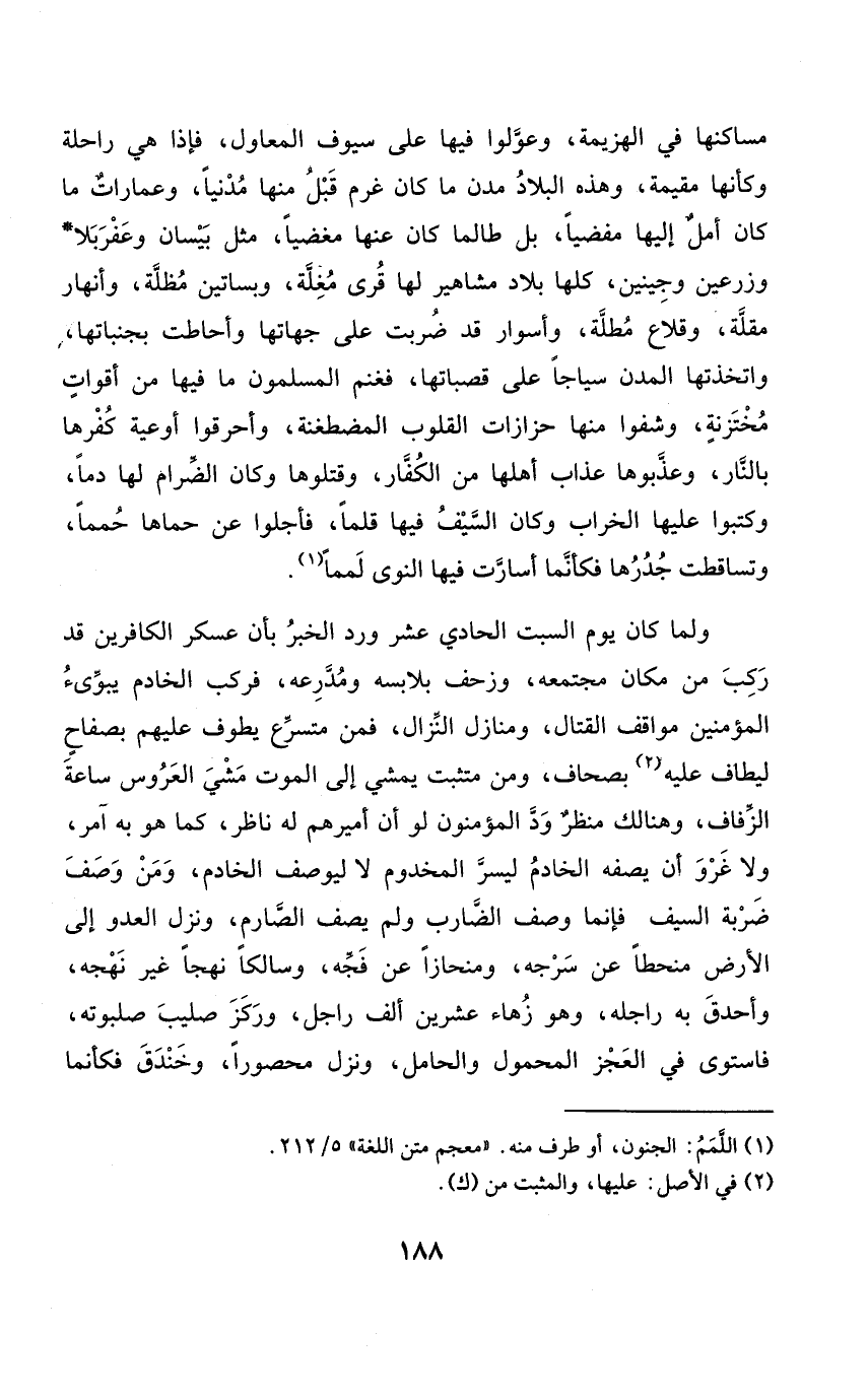 مساكنها فِي الْهَزِيمَة وعولوا فِيهَا على سيوف المعاول فَإِذا هِيَ رَاحِلَة وَكَأَنَّهَا مُقِيمَة وَهَذِه الْبِلَاد مدن مَا كَانَ غرم قبل مِنْهَا مدنيا وعمارات مَا كَانَ أمل إِلَيْهَا مفضيا بل طالما كَانَ عَنْهَا مغضيا مثل بيسان وعفربلا وزرعين وجينين كلهَا بِلَاد مشاهير لَهَا قرى مغلة وبساتين مظلة وأنهار مقلة وقلاع مطلة وأسوار قد ضربت على جهاتها وأحاطت بجنباتها واتخذتها المدن سياجا على قصباتها فغنم الْمُسلمُونَ مَا فِيهَا من أقوات مختزنة وشفوا مِنْهَا حزازات الْقُلُوب المضطغنة وأحرقوا أوعية كفرها بالنَّار وعذبوها عَذَاب أَهلهَا من الْكفَّار وقتلوها وَكَانَ الضرام لَهَا دَمًا وَكَتَبُوا عَلَيْهَا الخراب وَكَانَ السَّيْف فِيهَا قَلما فأجلوا عَن حماها حمما وتساقطت جدرها فَكَأَنَّمَا أسارت فِيهَا النَّوَى لمما