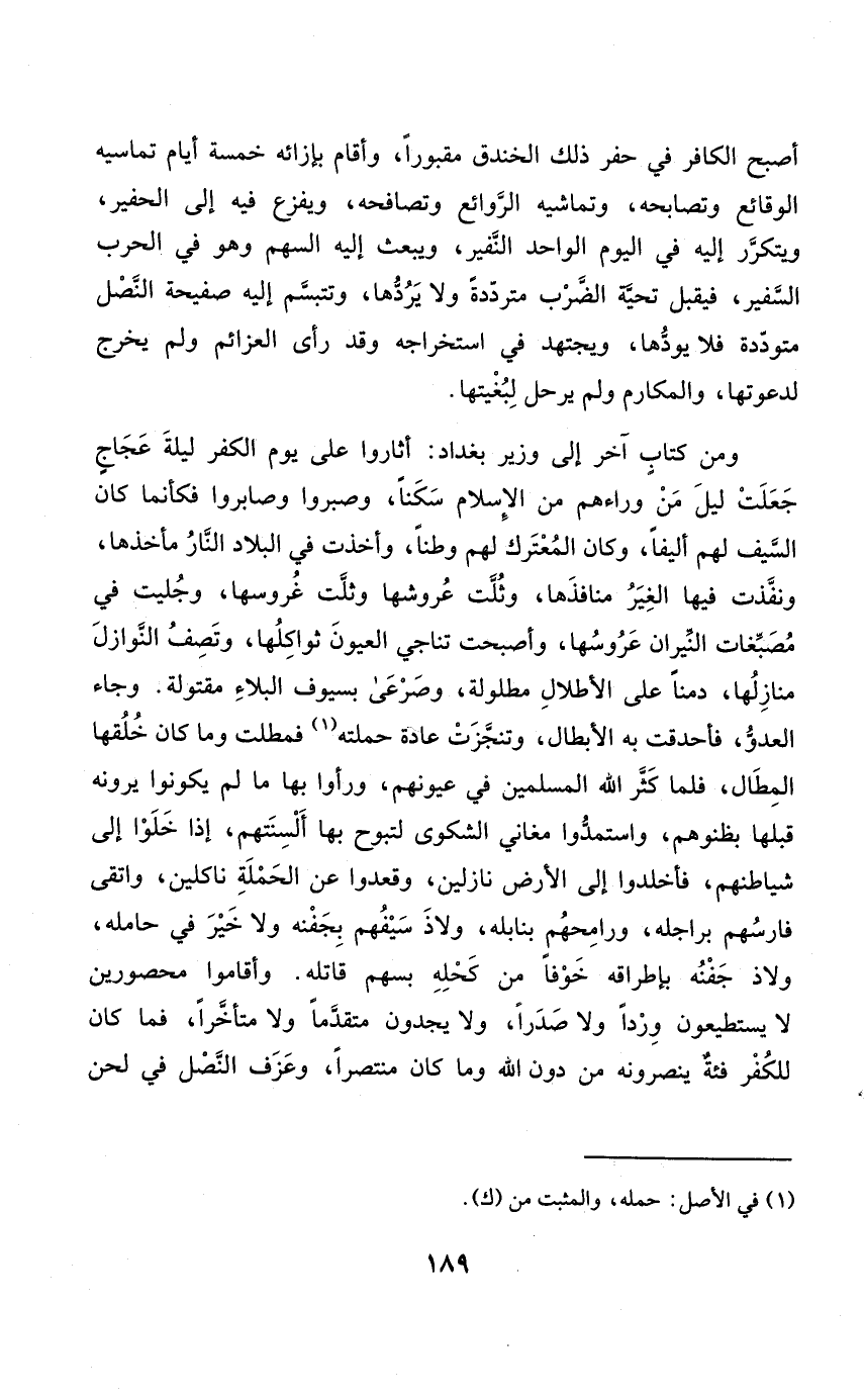 وَمن كتاب آخر إِلَى وَزِير بَغْدَاد أثاروا على يَوْم الْكفْر لَيْلَة عجاج جعلت ليل من وَرَاءَهُمْ من الْإِسْلَام سكنا وصبروا وَصَابِرُوا فَكَأَنَّمَا كَانَ السَّيْف لَهُم أليفا وَكَانَ المعترك لَهُم وطنا وَأخذت فِي الْبِلَاد النَّار مأخذها ونفذت فِيهَا الْغَيْر منافذها وثلت عروشها وثلت غروسها وجليت فِي مصبغات النيرَان عروسها وأصبحت تناجي الْعُيُون ثواكلها وتصف النَّوَازِل منازلها دمنا على الأطلال مطلولة وصرعى بسيوف الْبلَاء مقتولة