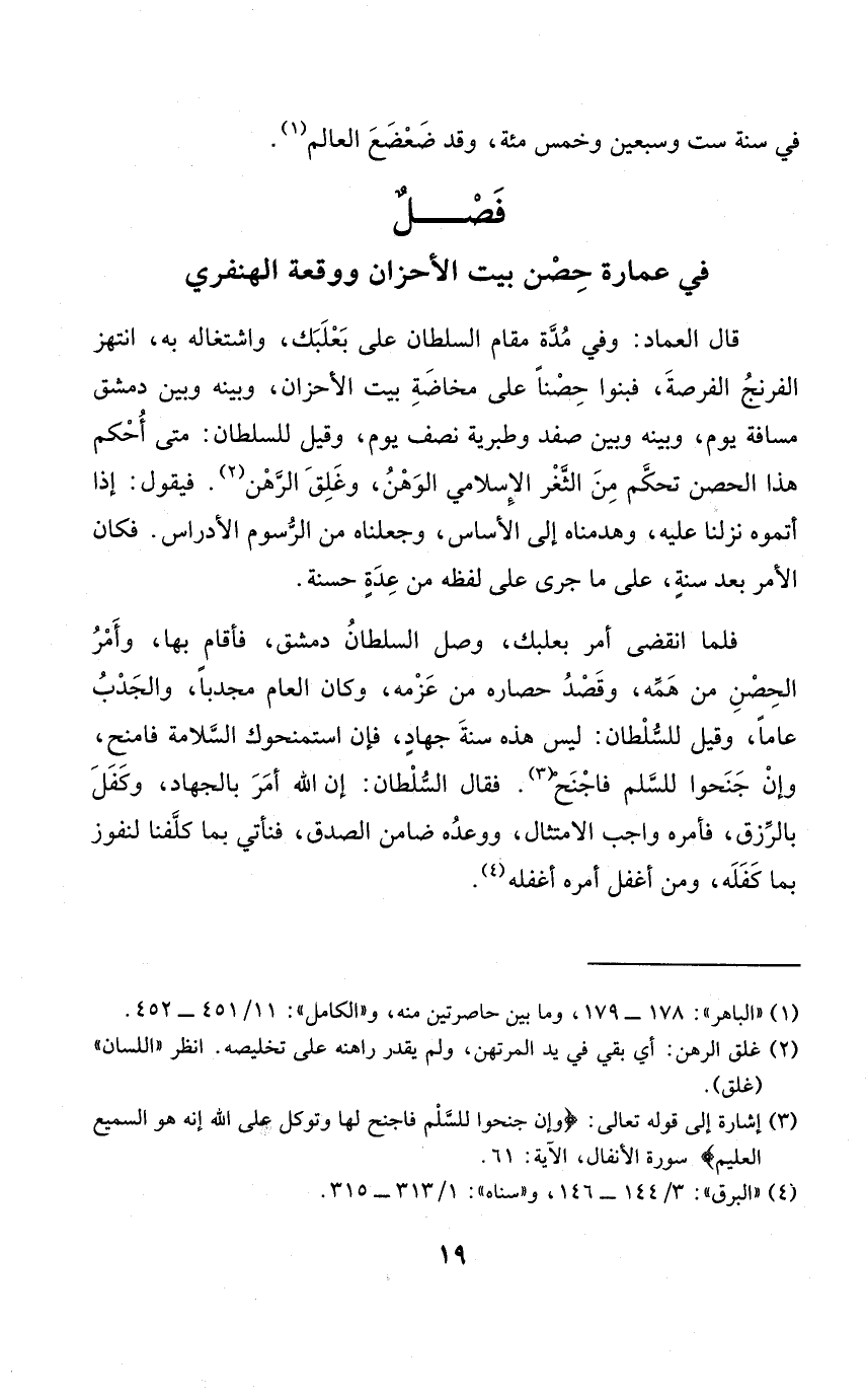 فَلَمَّا انْقَضى أَمر بعلبك وصل السُّلْطَان دمشق فَأَقَامَ بهَا وَأمر الْحصن من همه وَقصد حصاره من عزمه وَكَانَ الْعَام مجدبا والجدب عَاما وَقيل للسُّلْطَان لَيْسَ هَذِه سنة جِهَاد فَإِن استمنحوك السَّلامَة فامنح وَإِن جنحوا للسلم فاجنح