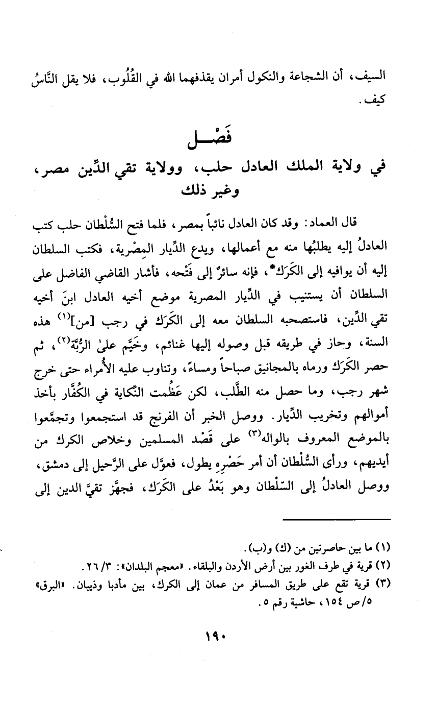قَالَ الْعِمَاد وَقد كَانَ الْعَادِل نَائِبا بِمصْر فَلَمَّا فتح السُّلْطَان حلب كتب الْعَادِل إِلَيْهِ يطْلبهَا مِنْهُ مَعَ أَعمالهَا ويدع الديار المصرية فَكتب السُّلْطَان إِلَيْهِ أَن يوافيه إِلَى الكرك فَإِنَّهُ سَائِر إِلَى فَتحه فَأَشَارَ القَاضِي الْفَاضِل على السُّلْطَان أَن يَسْتَنِيب فِي الديار المصرية مَوضِع أَخِيه الْعَادِل ابْن أَخِيه تَقِيّ الدّين فاستصحبه السُّلْطَان مَعَه إِلَى الكرك فِي رَجَب من هَذِه السّنة وَحَازَ فِي طَرِيقه قبل وُصُوله إِلَيْهَا غَنَائِم وخيم على الربة ثمَّ حصر الكرك ورماه بالمجانيق صباحا وَمَسَاء وتناوب عَلَيْهِ الْأُمَرَاء حَتَّى خرج شهر رَجَب وَمَا حصل مِنْهُ الطّلب لَكِن عظمت النكاية فِي الْكفَّار بِأخذ أَمْوَالهم وتخريب الديار