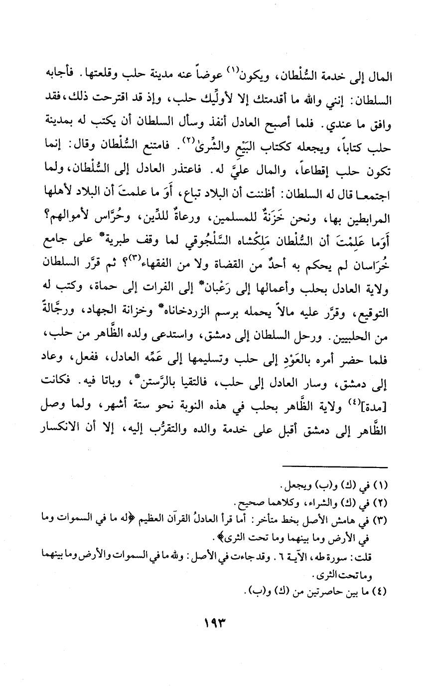 فَاعْتَذر الْعَادِل إِلَى السُّلْطَان وَلما اجْتمعَا قَالَ لَهُ السُّلْطَان أظننت أَن الْبِلَاد تبَاع أَو مَا علمت أَن الْبِلَاد لأَهْلهَا المرابطين بهَا وَنحن خَزَنَة للْمُسلمين ورعاة للدّين وحراس لأموالهم أَو مَا علمت أَن السُّلْطَان ملكشاه السلجوقي لما وقف طبرية على جَامع خُرَاسَان لم يحكم بِهِ أحد من الْقُضَاة وَلَا من الْفُقَهَاء ثمَّ قرر السُّلْطَان ولَايَة الْعَادِل بحلب وأعمالها إِلَى رعبان إِلَى الْفُرَات إِلَى حماة وَكتب لَهُ التوقيع وَقرر عَلَيْهِ مَالا يحملهُ برسم الزردخاناه وخزانة الْجِهَاد ورجالة من الحلبيين