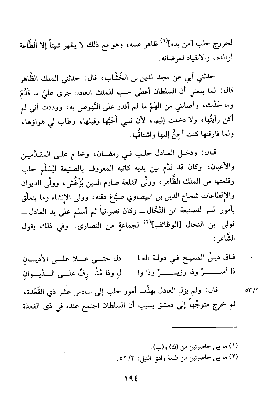 حَدثنِي أبي عَن مجد الدّين بن الخشاب قَالَ حَدثنِي الْملك الظَّاهِر قَالَ لما بَلغنِي أَن السُّلْطَان أعْطى حلب للْملك الْعَادِل جرى عَليّ مَا قدم وَمَا حدث وأصابني من الْهم مَا لم أقدر على النهوض بِهِ ووددت أَنِّي لم أكن رَأَيْتهَا وَلَا دخلت إِلَيْهَا لِأَن قلبِي أحبها وَقبلهَا وطاب لي هواؤها وَلما فارقتها كنت أحن إِلَيْهَا واشتاقها