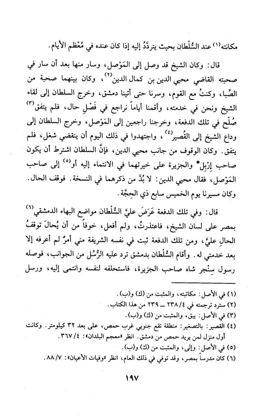 قَالَ وَكَانَ الشَّيْخ قد وصل إِلَى الْموصل وَسَار مِنْهَا بعد أَن سَار فِي صحبته القَاضِي محيي الدّين بن كَمَال الدّين وَكَانَ بَينهمَا صُحْبَة من الصِّبَا وَكنت مَعَ الْقَوْم وسرنا حَتَّى أَتَيْنَا دمشق وَخرج السُّلْطَان إِلَى لِقَاء الشَّيْخ وَنحن فِي خدمته وأقمنا أَيَّامًا نراجع فِي فصل حَال فَلم يتَّفق صلح فِي تِلْكَ الدفعة وَخَرجْنَا رَاجِعين إِلَى الْموصل وَخرج السُّلْطَان إِلَى وداع الشَّيْخ إِلَى الْقصير واجتهدوا فِي ذَلِك الْيَوْم أَن يَنْقَضِي شغل فَلم يتَّفق
