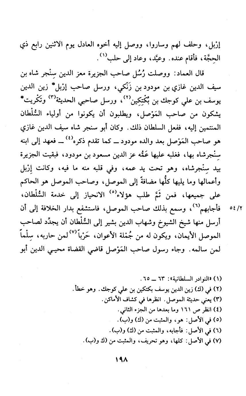 وَكَانَ أَبُو سنجر شاه سيف الدّين غَازِي هُوَ صَاحب الْموصل بعد وَالِده مودود كَمَا تقدم ذكره فعهد إِلَى ابْنه سنجرشاه بهَا فغلبه عَلَيْهَا عَمه عز الدّين مَسْعُود بن مودود فَبَقيت الجزيرة بيد سنجرشاه وَهُوَ تَحت يَد عَمه وَفِي قلبه مِنْهُ مَا فِيهِ وَكَانَت إربل وأعمالها وَمَا يَليهَا كلهَا مُضَافَة إِلَى الْموصل وَصَاحب الْموصل هُوَ الْحَاكِم على جَمِيعهَا فَمن ثمَّ طلب هَؤُلَاءِ الانحياز إِلَى خدمَة السُّلْطَان فأجابهم وَسمع بذلك صَاحب الْموصل فاستشفع بدار الْخلَافَة إِلَى أَن أرسل مِنْهَا شيخ الشُّيُوخ وشهاب الدّين بشير إِلَى السُّلْطَان أَن يجدد لصَاحب الْموصل الْأَيْمَان وَيكون لَهُ من جملَة الأعوان حَربًا لمن حاربه سلما لمن سالمه