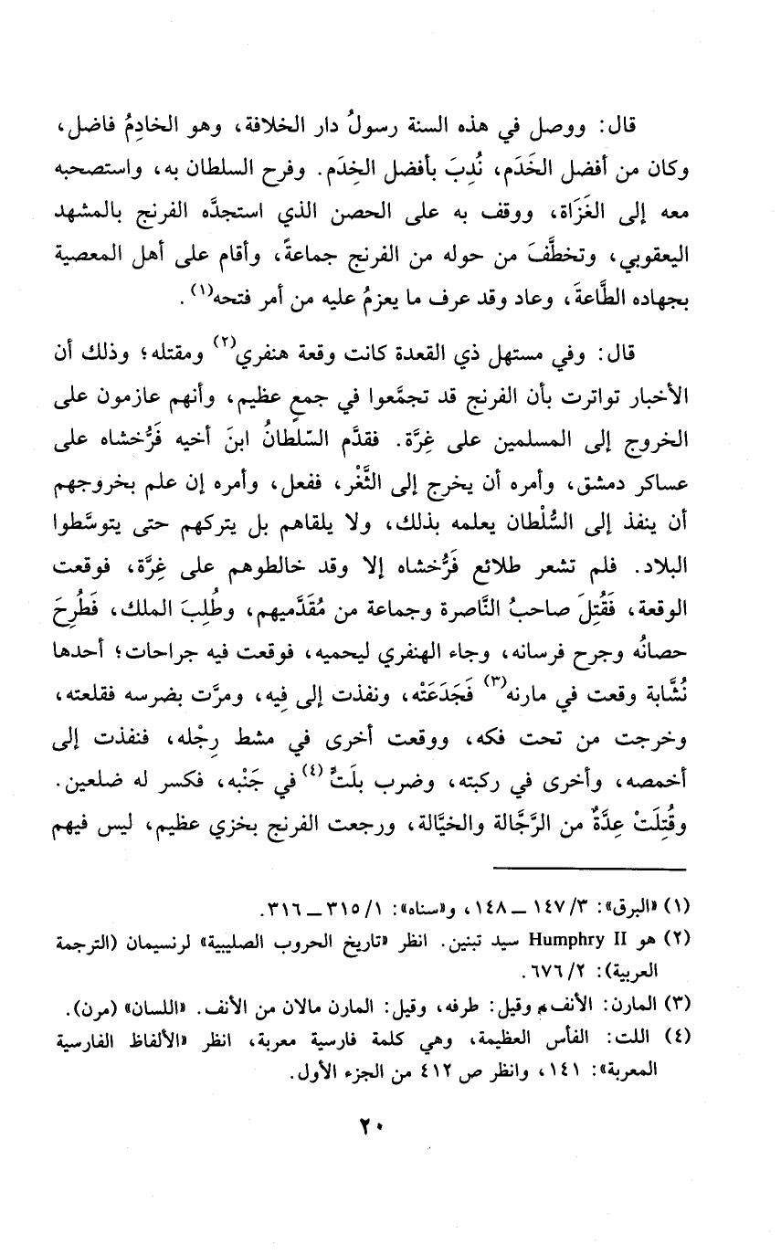 قَالَ وَفِي مستهل ذِي الْقعدَة كَانَت وقْعَة هنفري ومقتله وَذَلِكَ أَن الْأَخْبَار تَوَاتَرَتْ بِأَن الفرنج قد تجمعُوا فِي جمع عَظِيم وَأَنَّهُمْ عازمون على الْخُرُوج إِلَى الْمُسلمين على غرَّة