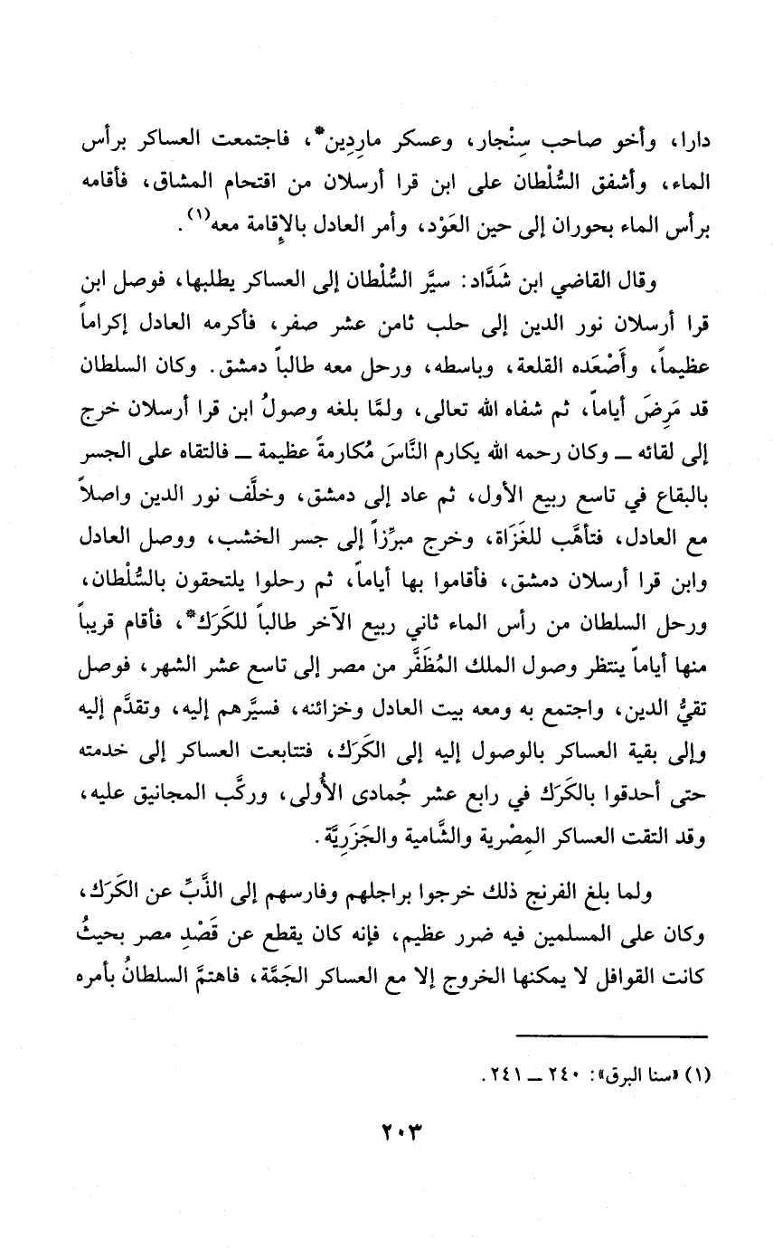 وَقَالَ القَاضِي ابْن شَدَّاد سير السُّلْطَان إِلَى العساكر يطْلبهَا فوصل ابْن قرا أرسلان نور الدّين إِلَى حلب ثامن عشر صفر فَأكْرمه الْعَادِل إِكْرَاما عَظِيما وأصعده القلعة وباسطه ورحل مَعَه طَالبا دمشق