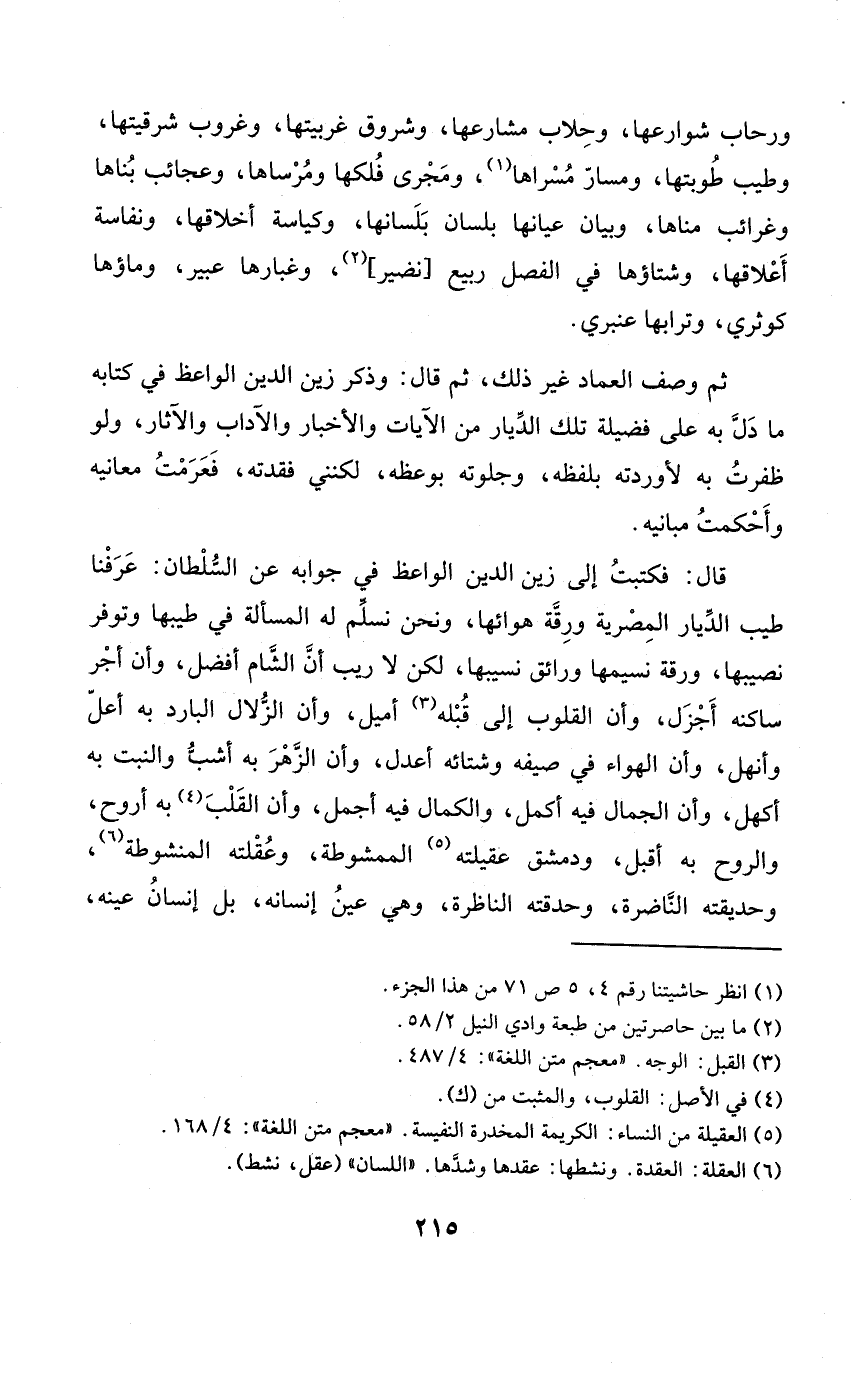 قَالَ فَكتبت إِلَى زين الدّين الْوَاعِظ فِي جَوَابه عَن السُّلْطَان عرفنَا طيب الديار المصرية ورقة هوائها وَنحن نسلم لَهُ الْمَسْأَلَة فِي طيبها وتوفر نصِيبهَا ورقة نسيمها ورائق نسيبها لَكِن لَا ريب أَن الشَّام أفضل وَأَن أجر ساكنه أجزل وَأَن الْقُلُوب إِلَى قبله أميل وَأَن الزلَال الْبَارِد بِهِ أعل وأنهل وَأَن الْهَوَاء فِي صيفه وشتائه أعدل وان الزهر بِهِ أشب والنبت بِهِ أكهل وَأَن الْجمال فِيهِ أكمل والكمال فِيهِ أجمل وَأَن الْقلب بِهِ أروح وَالروح بِهِ أقبل ودمشق عقيلته الممشوطة وعقلته المنشوطة وحديقته الناضرة وحدقته الناظرة وَهِي عين إنسانه بل إِنْسَان عينه