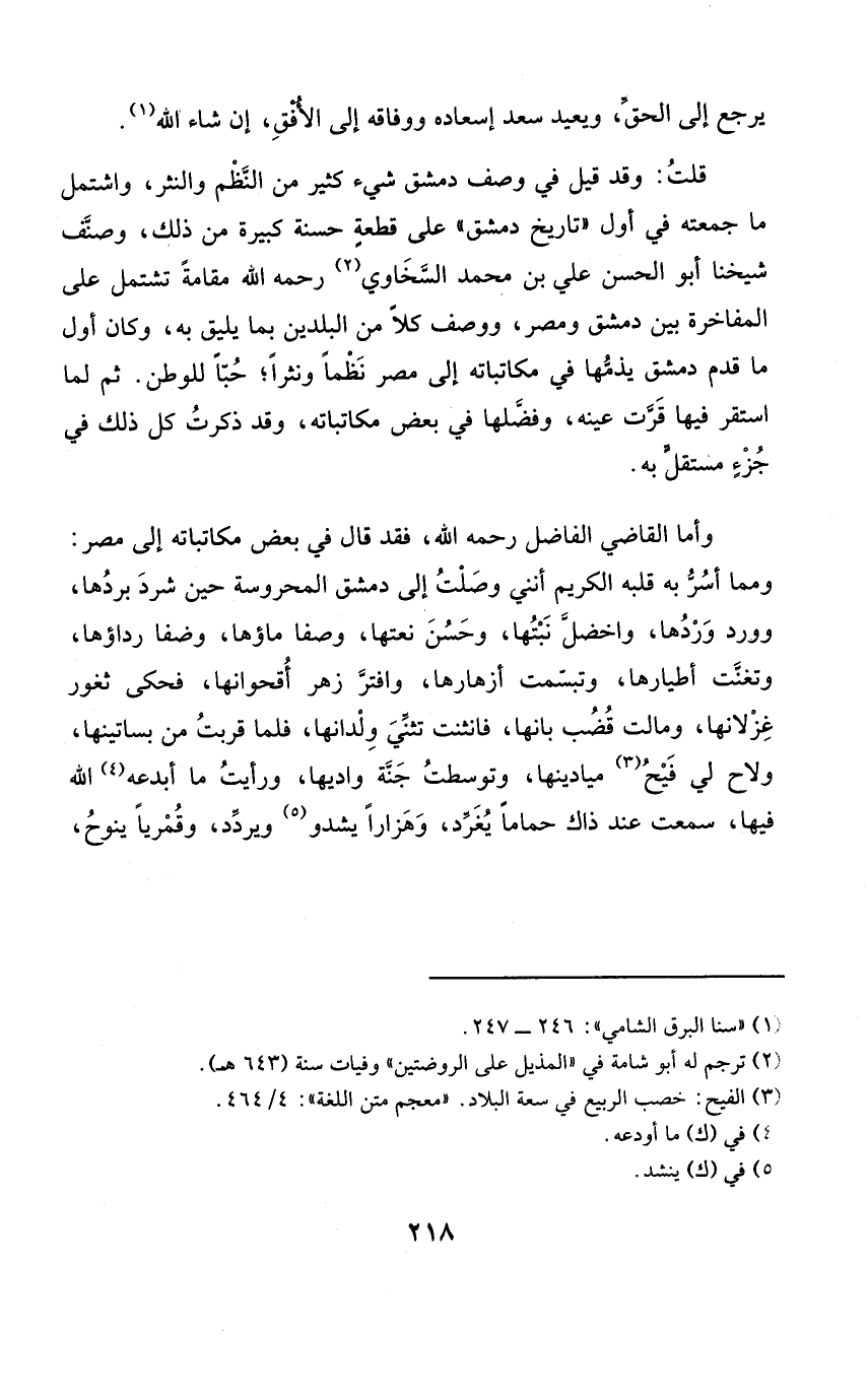 قلت وَقد قيل فِي وصف دمشق شَيْء كثير من النّظم والنثر واشتمل مَا جمعته فِي أول تَارِيخ دمشق على قِطْعَة حَسَنَة كَبِيرَة من ذَلِك وصنف شَيخنَا أَبُو الْحسن عَليّ بن مُحَمَّد السخاوي رَحمَه الله مقامة تشْتَمل على الْمُفَاخَرَة بَين دمشق ومصر وَوصف كلا من البلدين بِمَا يَلِيق بِهِ وَكَانَ أول مَا قدم دمشق يذمها فِي مكاتباته إِلَى مصر نظما ونثرا حبا للوطن