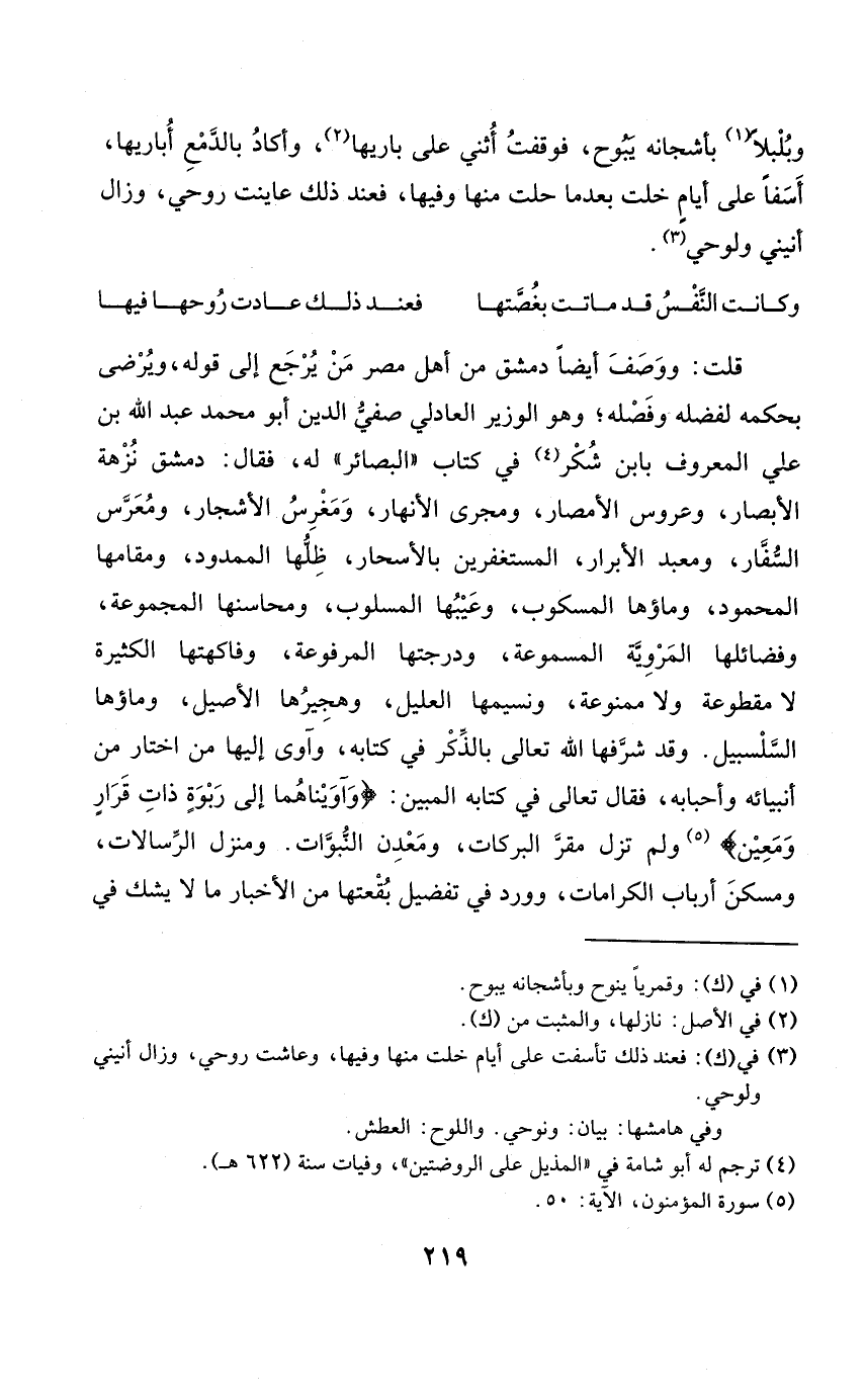 وبلبلا بأشجانه يبوح فوقفت أثني على باريها وأكاد بالدمع أباريها أسفا على أَيَّام خلت بَعْدَمَا حلت مِنْهَا وفيهَا فَعِنْدَ ذَلِك عَايَنت روحي وَزَالَ أنيني ولوحي