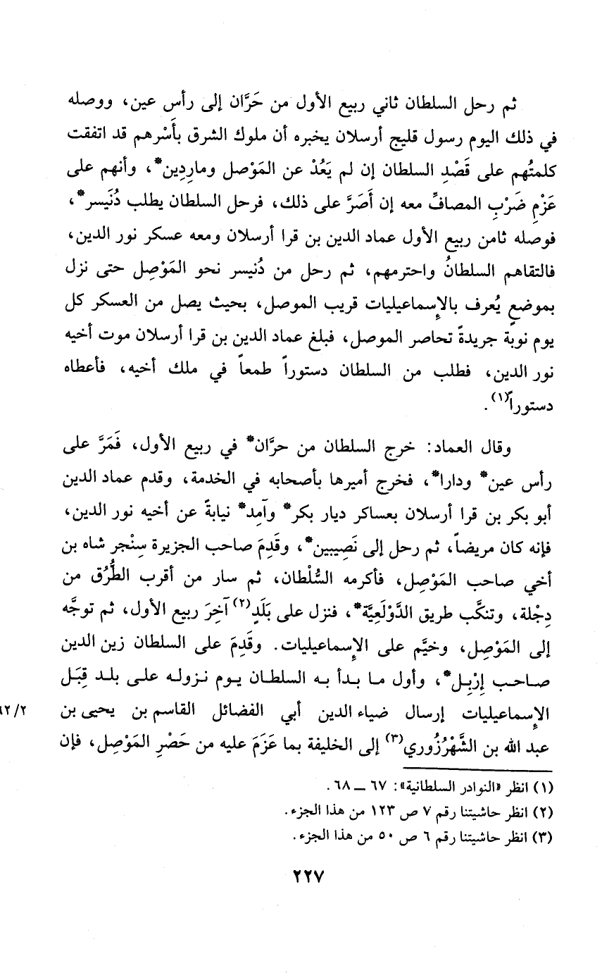 وَقَالَ الْعِمَاد خرج السُّلْطَان من حران فِي ربيع الأول فَمر على رَأس عين ودارا فَخرج أميرها بِأَصْحَابِهِ فِي الْخدمَة وَقدم عماد الدّين أَبُو بكر بن قرا أرسلان بعساكر ديار بكر وآمد نِيَابَة عَن أَخِيه نور الدّين فَإِنَّهُ كَانَ مَرِيضا ثمَّ رَحل إِلَى نَصِيبين وَقدم صَاحب الجزيرة سنجر شاه بن أخي صَاحب الْموصل فَأكْرمه السُّلْطَان ثمَّ سَار من أقرب الطّرق من دجلة وتنكب طَرِيق الدولعية فَنزل على بلد آخر ربيع الأول ثمَّ توجه إِلَى الْموصل وخيم على الإسماعيليات