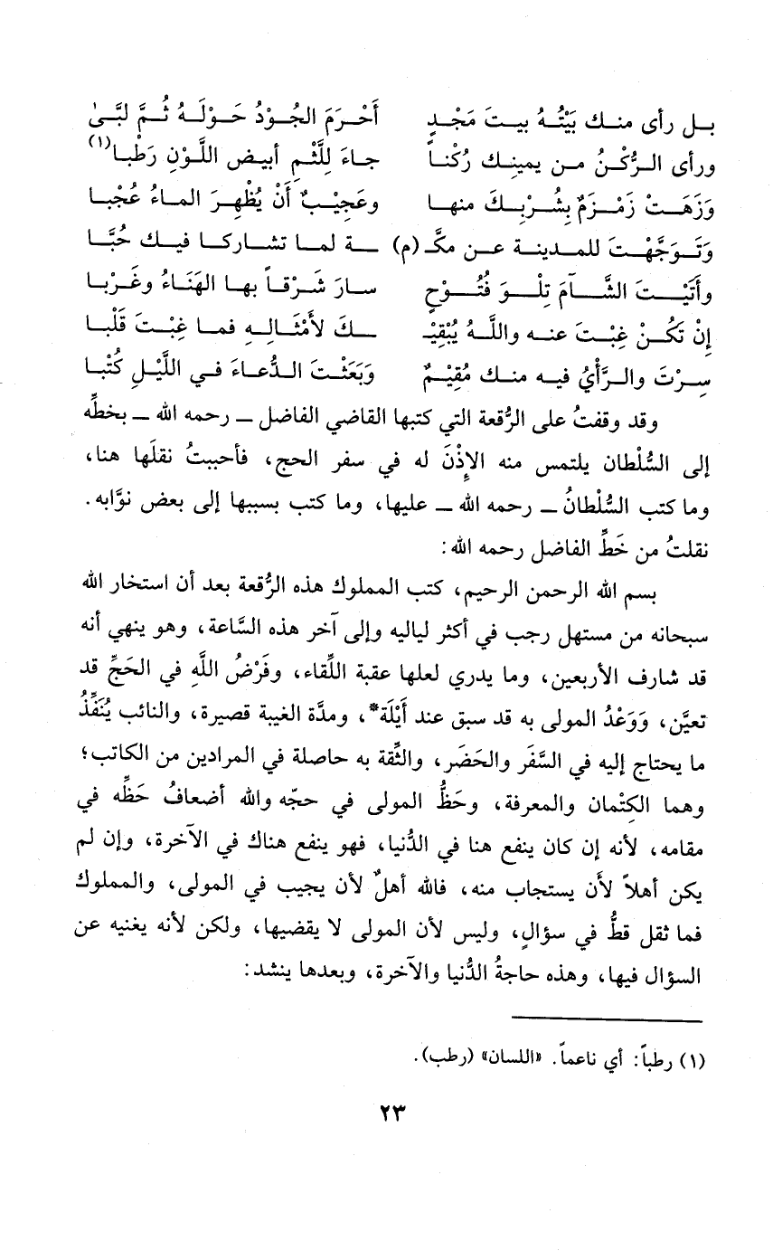 بِسم الله الرَّحْمَن الرَّحِيم كتب الْمَمْلُوك هَذِه الرقعة بعد أَن استخار الله سُبْحَانَهُ من مستهل رَجَب فِي أَكثر لياليه وَإِلَى آخر هَذِه السَّاعَة وَهُوَ يُنْهِي أَنه قد شَارف الْأَرْبَعين وَمَا يدْرِي لَعَلَّهَا عقبَة اللِّقَاء وَفرض الله فِي الْحَج قد تعين ووعد الْمولى بِهِ قد سبق عِنْد أَيْلَة وَمُدَّة الْغَيْبَة قَصِيرَة والنائب ينفذ مَا يحْتَاج إِلَيْهِ فِي السّفر والحضر والثقة بِهِ حَاصِلَة فِي المرادين من الْكَاتِب وهما الكتمان والمعرفة وحظ الْمولى فِي حجه وَالله أَضْعَاف حَظه فِي مقَامه لِأَنَّهُ إِن كَانَ ينفع هُنَا فِي الدُّنْيَا فَهُوَ ينفع هُنَاكَ فِي الْآخِرَة وَإِن لم يكن أَهلا لِأَن يُسْتَجَاب مِنْهُ فَالله أهل لِأَن يُجيب فِي الْمولى والمملوك فَمَا ثقل قطّ فِي سُؤال وَلَيْسَ لِأَن الْمولى لَا يَقْضِيهَا وَلَكِن لِأَنَّهُ يُغْنِيه عَن السُّؤَال فِيهَا وَهَذِه حَاجَة الدُّنْيَا وَالْآخِرَة وَبعدهَا ينشد