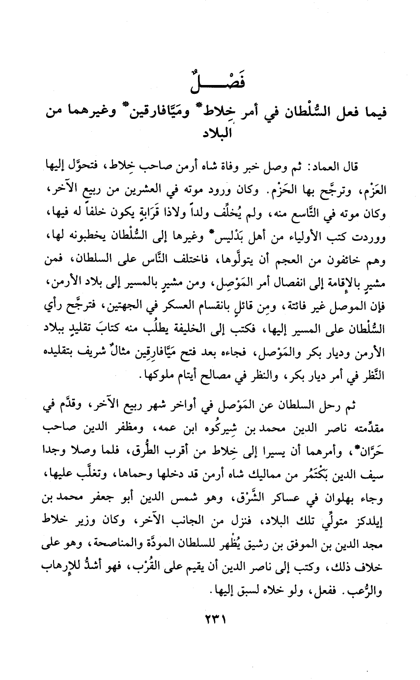 وَكَانَ وُرُود مَوته فِي الْعشْرين من ربيع الآخر وَكَانَ مَوته فِي التَّاسِع مِنْهُ وَلم يخلف ولدا ولاذا قرَابَة يكون خلفا لَهُ فِيهَا ووردت كتب الْأَوْلِيَاء من أهل بدليس وَغَيرهَا إِلَى السُّلْطَان يخطبونه لَهَا وهم خائفون من الْعَجم أَن يتولوها فَاخْتلف النَّاس على السُّلْطَان فَمن مشير بِالْإِقَامَةِ إِلَى انْفِصَال أَمر الْموصل وَمن مشير بِالْمَسِيرِ إِلَى بِلَاد الأرمن فَإِن الْموصل غير فَائِتَة وَمن قَائِل بانقسام الْعَسْكَر فِي الْجِهَتَيْنِ فترجح رَأْي السُّلْطَان على الْمسير إِلَيْهَا فَكتب إِلَى الْخَلِيفَة يطْلب مِنْهُ كتاب تَقْلِيد بِبِلَاد الأرمن وديار بكر والموصل فَجَاءَهُ بعد فتح ميافارقين مِثَال شرِيف بتقليده النّظر فِي أَمر ديار بكر وَالنَّظَر فِي مصَالح أَيْتَام مُلُوكهَا