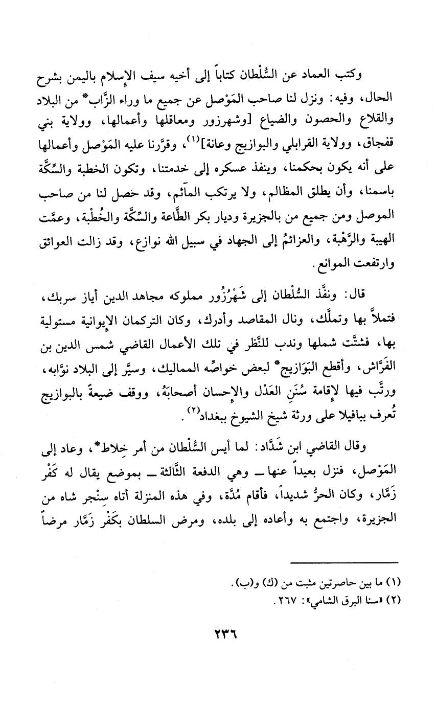 وَكتب الْعِمَاد عَن السُّلْطَان كتابا إِلَى أَخِيه سيف الْإِسْلَام بِالْيمن بشرح الْحَال وَفِيه وَنزل لنا صَاحب الْموصل عَن جَمِيع مَا وَرَاء الزاب من الْبِلَاد والقلاع والحصون والضياع وشهرزور ومعاقلها وأعمالها وَولَايَة بني قفجاق وَولَايَة القرابلي والبوازيج وعانة وقررنا عَلَيْهِ الْموصل وأعمالها على أَنه يكون بحكمنا وَينفذ عسكره إِلَى خدمتنا وَتَكون الْخطْبَة وَالسِّكَّة باسمنا وَأَن يُطلق الْمَظَالِم وَلَا يرتكب المآثم وَقد حصل لنا من صَاحب الْموصل وَمن جَمِيع من بالجزيرة وديار بكر الطَّاعَة وَالسِّكَّة وَالْخطْبَة وعمت الهيبة والرهبة والعزائم إِلَى الْجِهَاد فِي سَبِيل الله نوازع وَقد زَالَت الْعَوَائِق وَارْتَفَعت الْمَوَانِع