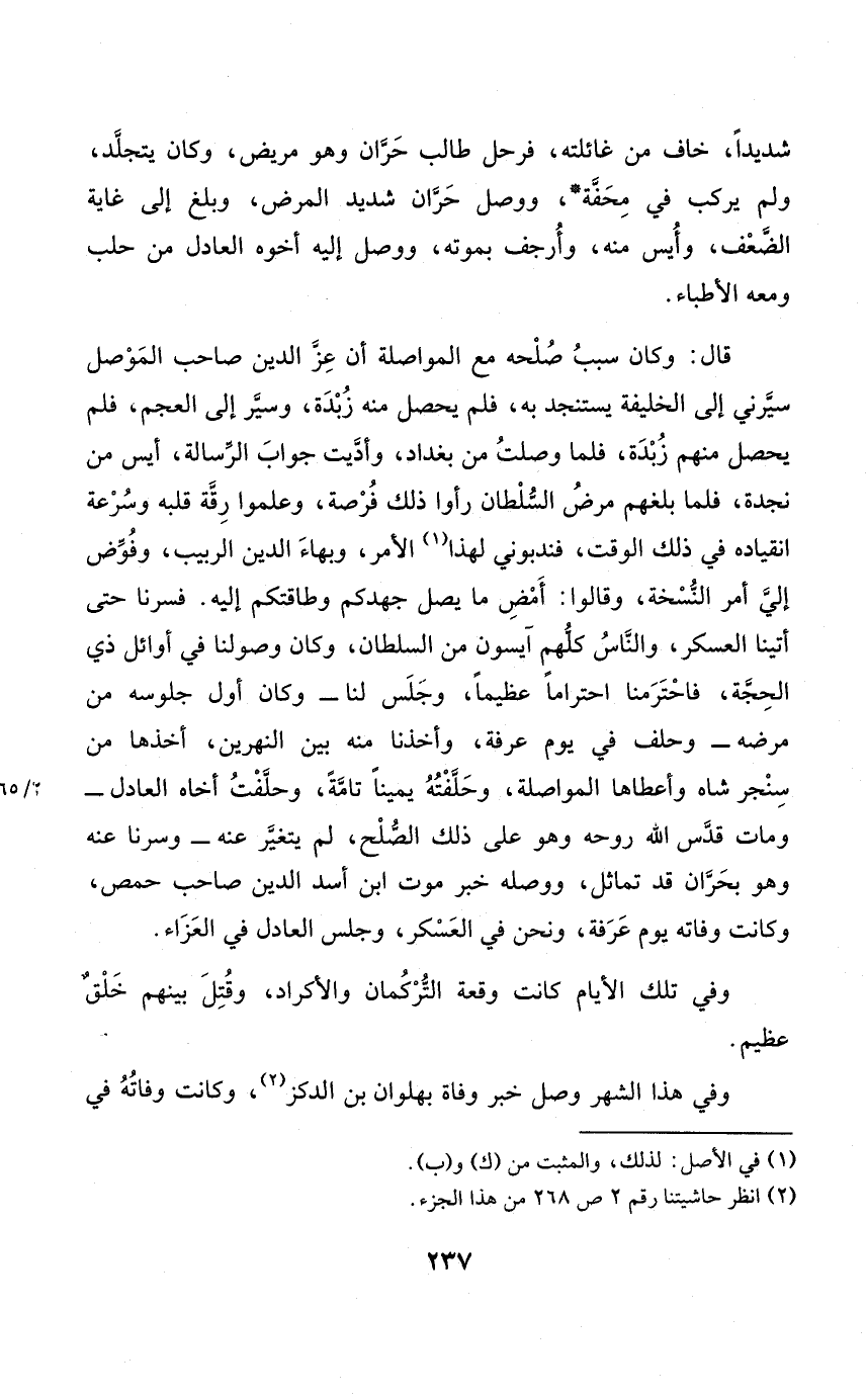 فسرنا حَتَّى أَتَيْنَا الْعَسْكَر وَالنَّاس كلهم آيسون من السُّلْطَان وَكَانَ وصولنا فِي أَوَائِل ذِي الْحجَّة فاحترمنا احتراما عَظِيما وَجلسَ لنا وَكَانَ أول جُلُوسه من مَرضه وَحلف فِي يَوْم عَرَفَة وأخذنا مِنْهُ بَين النهرين أَخذهَا من سنجر شاه وَأَعْطَاهَا المواصلة وحلفته يَمِينا تَامَّة وَحلفت أَخَاهُ الْعَادِل وَمَات قدس الله روحه وَهُوَ على ذَلِك الصُّلْح لم يتَغَيَّر عَنهُ وسرنا عَنهُ وَهُوَ بحران قد تماثل وَوَصله خبر موت ابْن أَسد الدّين صَاحب حمص وَكَانَت وَفَاته يَوْم عَرَفَة وَنحن فِي الْعَسْكَر وَجلسَ الْعَادِل فِي العزاء