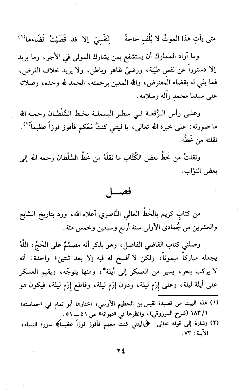 وصلني كتاب القَاضِي الْفَاضِل وَهُوَ يذكر أَنه مصمم على الْحَج الله يَجعله مُبَارَكًا ميمونا وَلَكِن لَا أفسح لَهُ فِيهِ إِلَّا بعد ثِنْتَيْنِ وَاحِدَة أَنه لَا يركب بَحر يسير من الْعَسْكَر إِلَى أَيْلَة وَمِنْهَا يتَوَجَّه وَيُقِيم الْعَسْكَر على أَيْلَة لَيْلَة وعَلى إرم لَيْلَة وَدون إرم لَيْلَة وقاطع إرم لَيْلَة فَيكون هُوَ