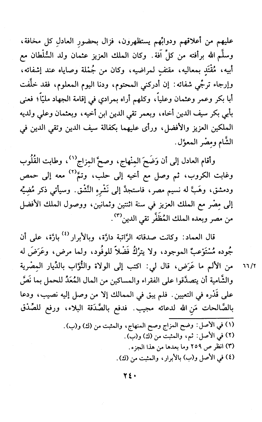 وَكَانَ الْملك الْعَزِيز عُثْمَان ولد السُّلْطَان مَعَ أَبِيه مقتد بمعاليه مقتف لمراضيه وَكَانَ من جملَة وَصَايَاهُ عِنْد إشفائه وإرجاء ترجي شفائه إِن أدركني المحتوم ودنا الْيَوْم الْمَعْلُوم فقد خلفت أَبَا بكر وَعمر وَعُثْمَان وعليا وَكلهمْ أرَاهُ بمرادي فِي إِقَامَة الْجِهَاد مَلِيًّا فعنى بِأبي بكر سيف الدّين أَخَاهُ وبعمر تَقِيّ الدّين ابْن أَخِيه وبعثمان وَعلي ولديه الْملكَيْنِ الْعَزِيز وَالْأَفْضَل وَرَأى عَلَيْهِمَا بكفالة سيف الدّين وتقي الدّين فِي الشَّام ومصر الْمعول