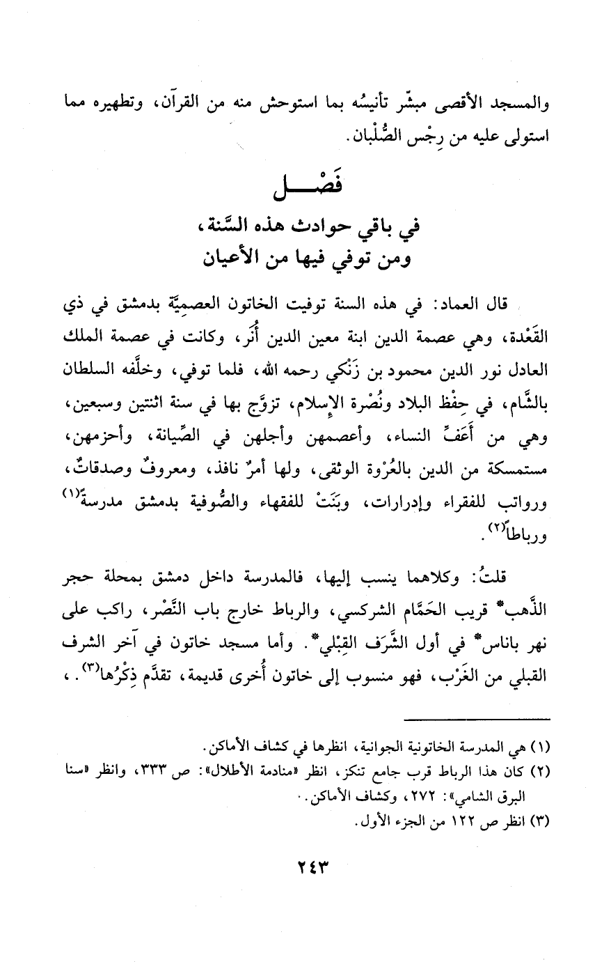 قلت وَكِلَاهُمَا ينْسب إِلَيْهَا فالمدرسة دَاخل دمشق بمحلة حجر الذَّهَب قريب الْحمام الشركسي والرباط خَارج بَاب النَّصْر رَاكب على نهر باناس فِي أول الشّرف القبلي