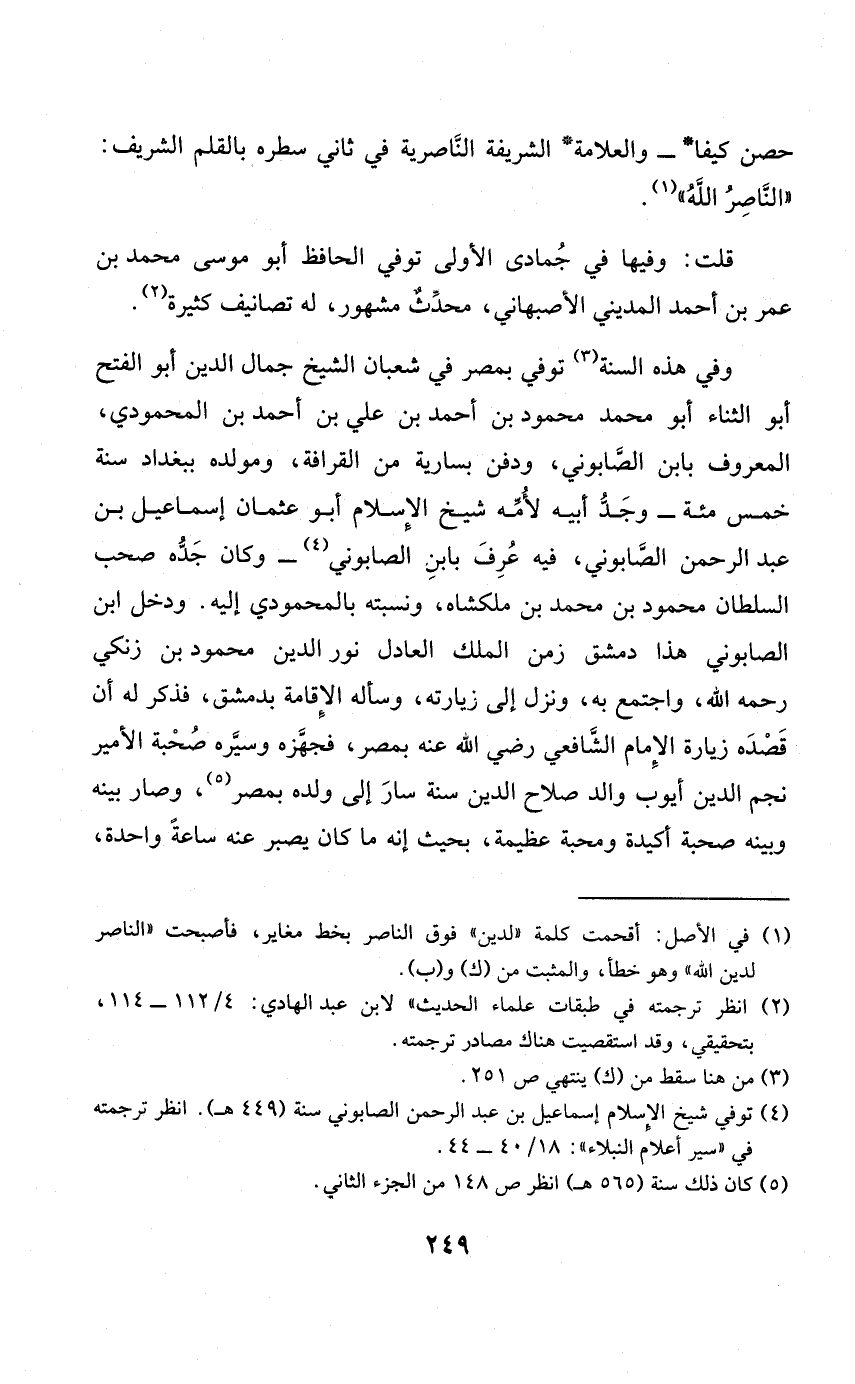 وَفِي هَذِه السّنة توفّي بِمصْر فِي شعْبَان الشَّيْخ جمال الدّين أَبُو الْفَتْح أَبُو الثَّنَاء أَبُو مُحَمَّد مَحْمُود بن أَحْمد بن عَليّ بن أَحْمد بن المحمودي الْمَعْرُوف بِابْن الصَّابُونِي وَدفن بِسَارِيَة من القرافة ومولده بِبَغْدَاد سنة خمس مئة وجد أَبِيه لأمه شيخ الْإِسْلَام أَبُو عُثْمَان إِسْمَاعِيل بن عبد الرَّحْمَن الصَّابُونِي فِيهِ عرف بِابْن الصَّابُونِي وَكَانَ جده صحب السُّلْطَان مَحْمُود بن مُحَمَّد بن ملكشاه ونسبته بالمحمودي إِلَيْهِ