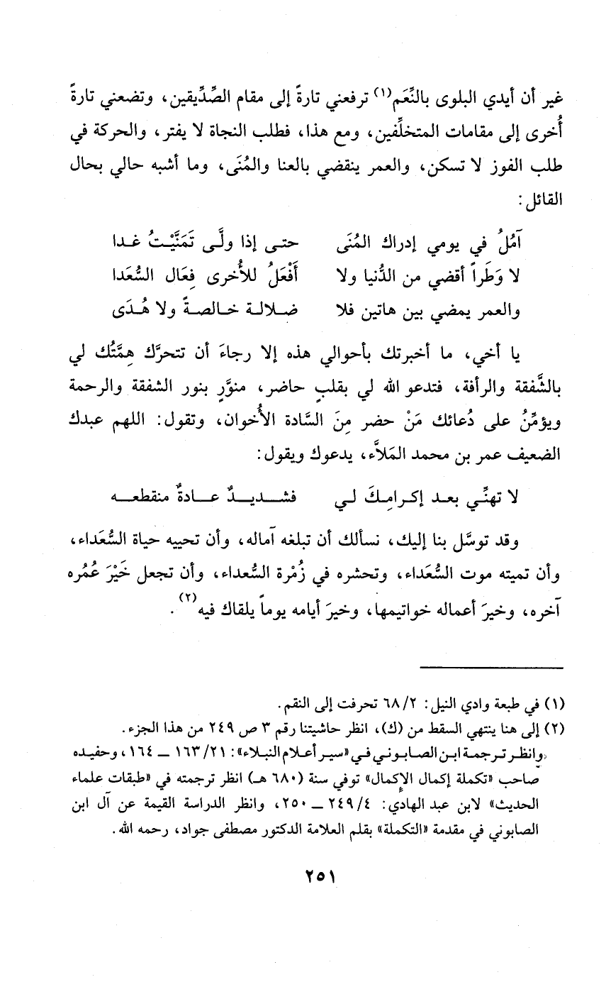 غير أَن أَيدي الْبلوى بِالنعَم ترفعني تَارَة إِلَى مقَام الصديقين وتضعني تَارَة أُخْرَى إِلَى مقامات المتخلفين وَمَعَ هَذَا فَطلب النجَاة لَا يفتر وَالْحَرَكَة فِي طلب الْفَوْز لَا تسكن والعمر يَنْقَضِي بالعنا والمنى وَمَا أشبه حَالي بِحَال الْقَائِل
