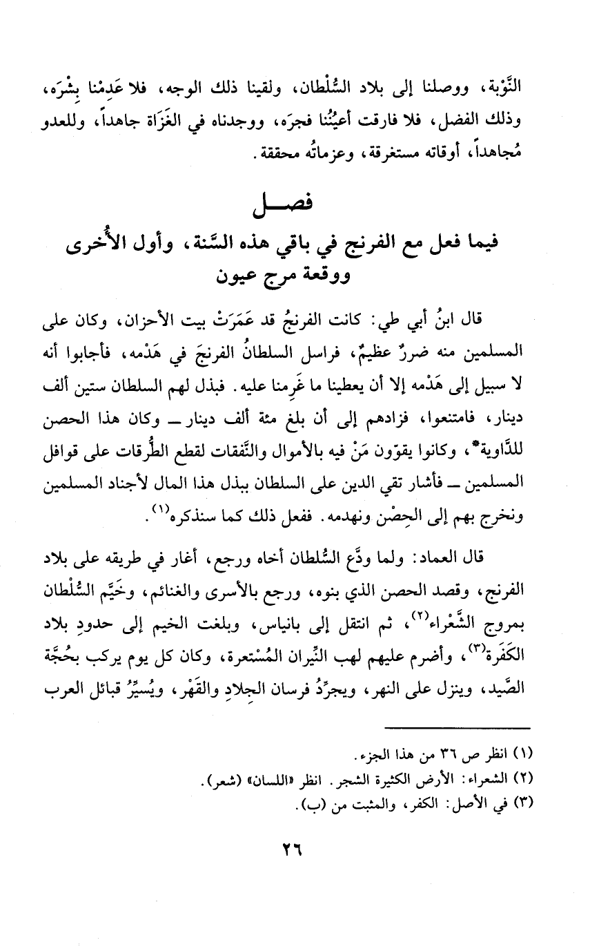 فصل فِيمَا فعل مَعَ الفرنج فِي بَاقِي هَذِه السّنة وَأول الْأُخْرَى ووقعة مرج عُيُون