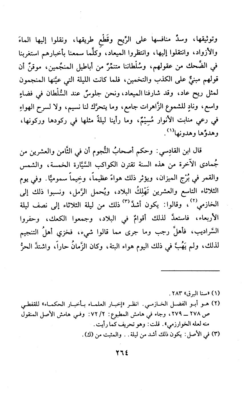 وتوثيقها وسد منافسها على الرّيح وَقطع طريقها ونقلوا إِلَيْهَا المَاء والأزواد وانتقلوا إِلَيْهَا وَانْتَظرُوا الميعاد وَكلما سمعنَا بأخبارهم استغربنا فِي الضحك من عُقُولهمْ وسلطاننا متنمر من أباطيل المنجمين موقن أَن قَوْلهم مَبْنِيّ على الْكَذِب والتخمين فَلَمَّا كَانَت اللَّيْلَة الَّتِي عينهَا المنجمون لمثل ريح عَاد وَقد شارفنا الميعاد وَنحن جُلُوس عِنْد السُّلْطَان فِي فضاء وَاسع وناد للشموع الزاهرات جَامع وَمَا يَتَحَرَّك لنا نسيم وَلَا لسرح الْهَوَاء فِي رعي منابت الْأَنْوَار مسيم وَمَا رَأينَا لَيْلَة مثلهَا فِي ركودها وركونها وهدوها وهدونها