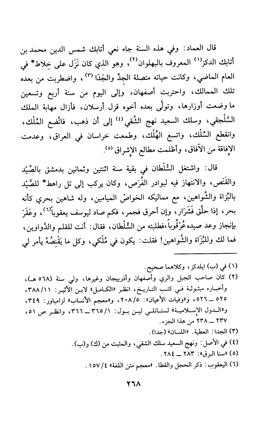 قَالَ الْعِمَاد وَفِي هَذِه السّنة جَاءَ نعي أتابك شمس الدّين مُحَمَّد بن أتابك الدكز الْمَعْرُوف بالبهلوان وَهُوَ الَّذِي كَانَ نزل على خلاط فِي الْعَام الْمَاضِي وَكَانَت حَيَاته مُتَّصِلَة الْجد والجدا واضطربت من بعده تِلْكَ الممالك واحتربت أصفهان وَإِلَى الْيَوْم من سنة أَربع وَتِسْعين مَا وضعت أَوزَارهَا وَتَوَلَّى بعده أَخُوهُ قزل أرسلان فأزال مهابة الْملك السلجقي وسلك السعيد نهج الشقي إِلَى أَن ذهب فاتضع الْملك وَانْقطع السلك واتسع الهلك وطمعت خُرَاسَان فِي الْعرَاق وعدمت الْإِفَاقَة من الْآفَاق وأظلمت مطالع الْإِشْرَاق
