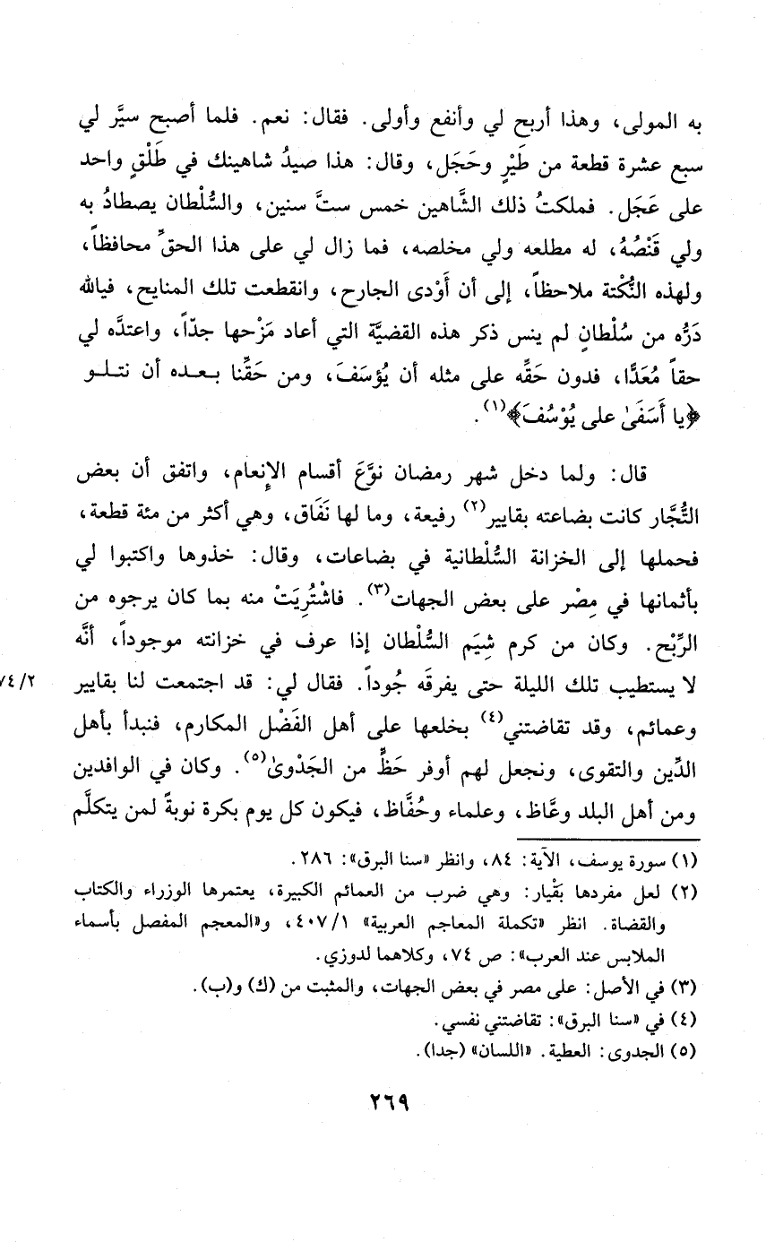 فملكت ذَلِك الشاهين خمس سِتّ سِنِين وَالسُّلْطَان يصطاد بِهِ ولي قنصه لَهُ مطلعه ولي مخلصه فَمَا زَالَ لي على هَذَا الْحق محافظا ولهذه النُّكْتَة ملاحظا إِلَى أَن أودى الْجَارِح وانقطعت تِلْكَ المنايح فيالله دره من سُلْطَان لم ينس ذكر هَذِه الْقَضِيَّة الَّتِي أعَاد مزحها جدا واعتده لي حَقًا معدا فدون حَقه على مثله أَن يؤسف وَمن حَقنا بعده أَن نتلو {يَا أسفى على يُوسُف}