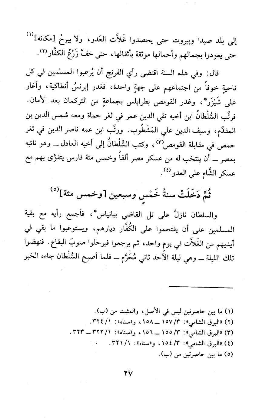 وَالسُّلْطَان نَازل على تل القَاضِي ببانياس فأجمع رَأْيه مَعَ بَقِيَّة الْمُسلمين على أَن يقتحموا على الْكفَّار دِيَارهمْ ويستوعبوا مَا بَقِي فِي أَيْديهم من الغلات فِي يَوْم وَاحِد ثمَّ يرجِعوا فيرحلوا صوب الْبِقَاع