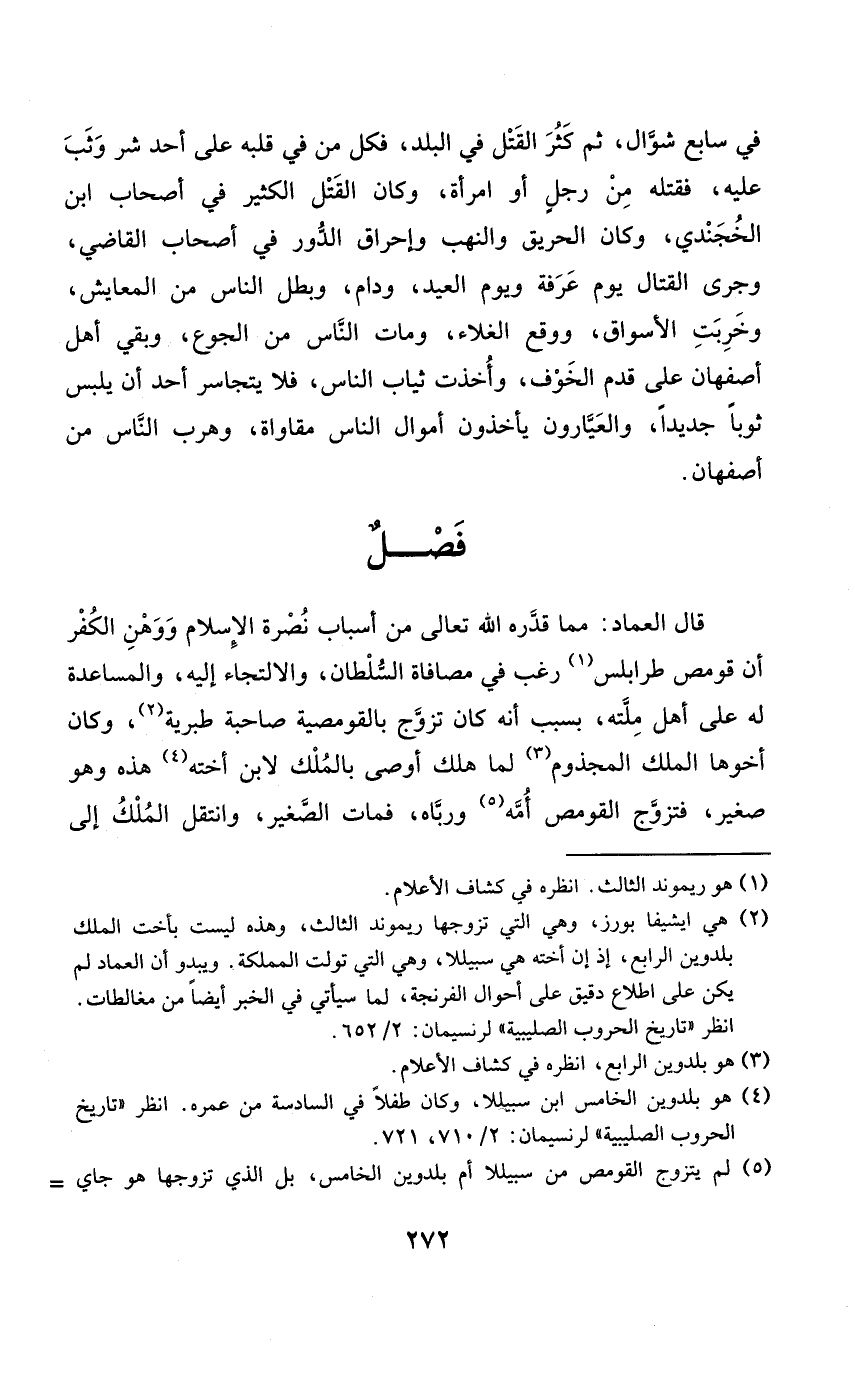 قَالَ الْعِمَاد مِمَّا قدره الله تَعَالَى من أَسبَاب نصْرَة الْإِسْلَام ووهن الْكفْر أَن قومص طرابلس رغب فِي مصافاة السُّلْطَان والالتجاء إِلَيْهِ والمساعدة لَهُ على أهل مِلَّته بِسَبَب أَنه كَانَ تزوج بالقومصية صَاحِبَة طبرية وَكَانَ أَخُوهَا الْملك المجذوم لما هلك أوصى بِالْملكِ لِابْنِ أُخْته هَذِه وَهُوَ صَغِير فَتزَوج القومص أمه ورباه فَمَاتَ الصَّغِير وانتقل الْملك إِلَى