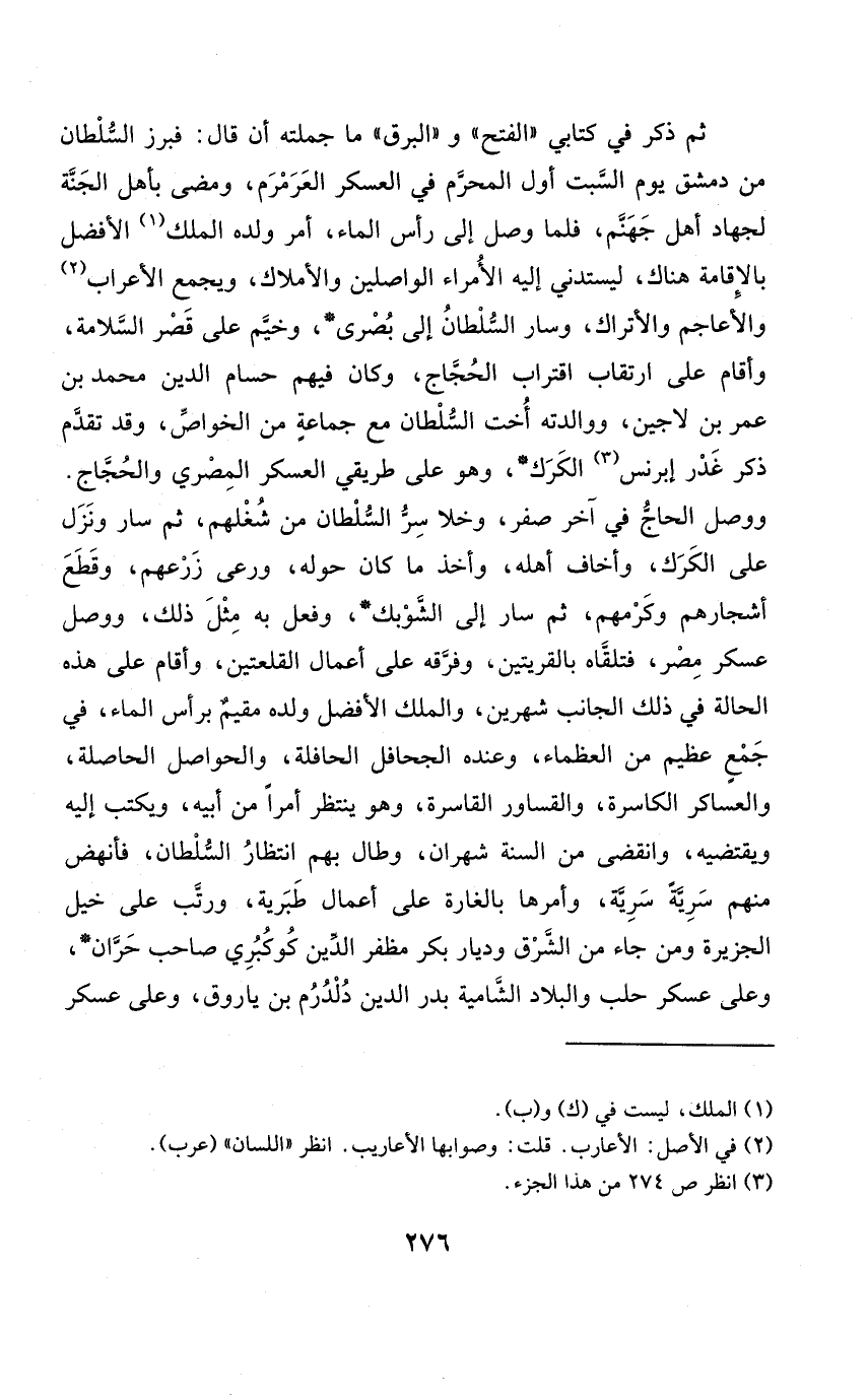 ثمَّ ذكر فِي كتابي الْفَتْح والبرق مَا جملَته أَن قَالَ فبرز السُّلْطَان من دمشق يَوْم السبت أول الْمحرم فِي الْعَسْكَر العرمرم وَمضى بِأَهْل الْجنَّة لجهاد أهل جَهَنَّم فَلَمَّا وصل إِلَى رَأس المَاء أَمر وَلَده الْملك الْأَفْضَل بِالْإِقَامَةِ هُنَاكَ ليستدني إِلَيْهِ الْأُمَرَاء الواصلين والأملاك وَيجمع الْأَعْرَاب والأعاجم والأتراك وَسَار السُّلْطَان إِلَى بصرى وخيم على قصر السَّلامَة وَأقَام على ارتقاب اقتراب الْحجَّاج وَكَانَ فيهم حسام الدّين مُحَمَّد بن عمر بن لاجين ووالدته أُخْت السُّلْطَان مَعَ جمَاعَة من الْخَواص وَقد تقدم ذكر غدر إبرنس الكرك وَهُوَ على طريقي الْعَسْكَر الْمصْرِيّ وَالْحجاج