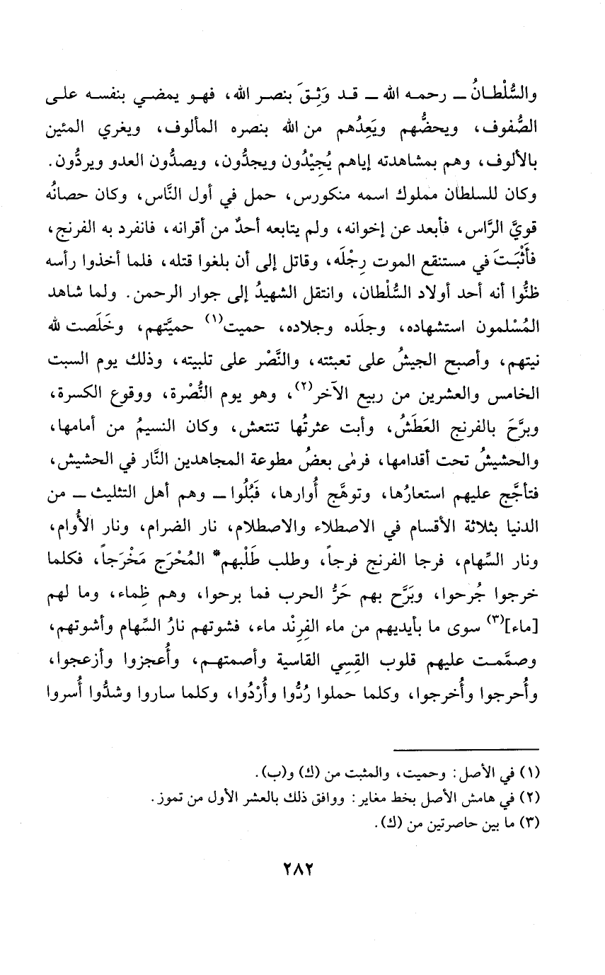 وَالسُّلْطَان رَحمَه الله قد وثق بنصر الله فَهُوَ يمْضِي بِنَفسِهِ على الصُّفُوف ويحضهم ويعدهم من الله بنصره المألوف ويغري المئين بالألوف وهم بمشاهدته إيَّاهُم يجيدون ويجدون ويصدون الْعَدو ويردون