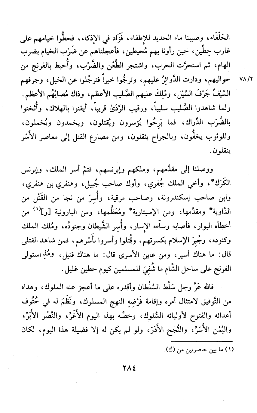 ووصلنا إِلَى مقدمهم وملكهم وإبرنسهم فتم أسر الْملك وإبرنس الكرك وَأخي الْملك جفري وأوك صَاحب جبيل وهنفري بن هنفري وَابْن صَاحب إسكندرونة وَصَاحب مرقية وَأسر من نجا من الْقَتْل من الداوية ومقدمها وَمن الإسبتارية ومعظمها وَمن البارونية وَمن أخطأه الْبَوَار فَأَصَابَهُ وسآءه الإسار وَأسر الشَّيْطَان وَجُنُوده وَملك الْملك وكنوده وجبر الْإِسْلَام بكسرتهم وَقتلُوا وأسروا بأسرهم فَمن شَاهد الْقَتْلَى قَالَ مَا هُنَاكَ أَسِير وَمن عاين الأسرى قَالَ مَا هُنَاكَ قَتِيل ومذ استولى الفرنج على سَاحل الشَّام مَا شفي للْمُسلمين كَيَوْم حطين غليل
