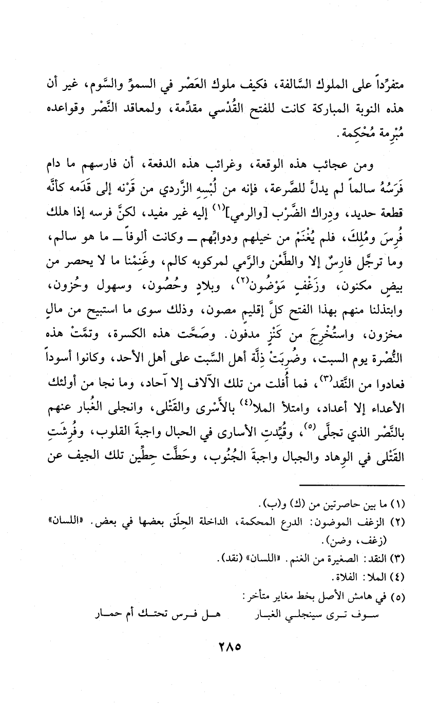 وَمن عجائب هَذِه الْوَقْعَة وغرائب هَذِه الدفعة أَن فارسهم مَا دَامَ فرسه سالما لم يدل للصرعة فَإِنَّهُ من لبسه الزردي من قرنه إِلَى قدمه كَأَنَّهُ قِطْعَة حَدِيد ودراك الضَّرْب وَالرَّمْي إِلَيْهِ غير مُفِيد لَكِن فرسه إِذا هلك فرس وَملك فَلم يغنم من خيلهم ودوابهم وَكَانَت ألوفا مَا هُوَ سَالم وَمَا ترجل فَارس إِلَّا والطعن وَالرَّمْي لمركوبه كالم وغنمنا مَا لَا يحصر من بيض مَكْنُون وزغف موضون وبلاد وحصون وسهول وحزون وابتذلنا مِنْهُم بِهَذَا الْفَتْح كل إقليم مصون وَذَلِكَ سوى مَا استبيح من مَال مخزون واستخرج من كنز مدفون