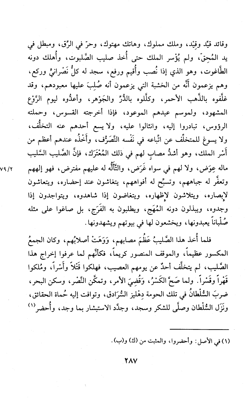 وقائد قيد وَقيد وَملك مَمْلُوك وهاتك مهتوك وحر فِي الرّقّ ومبطل فِي يَد المحق وَلم يؤسر الْملك حَتَّى أَخذ صَلِيب الصلبوت وَأهْلك دونه الطاغوت وَهُوَ الَّذِي إِذا نصب وأقيم وَرفع سجد لَهُ كل نَصْرَانِيّ وَركع وهم يَزْعمُونَ أَنه من الْخَشَبَة الَّتِي يَزْعمُونَ أَنه صلب عَلَيْهَا معبودهم وَقد غلفوه بِالذَّهَب الْأَحْمَر وكللوه بالدر والجوهر وأعدوه ليَوْم الروع الْمَشْهُود ولموسم عَلَيْهِم الْمَوْعُود فَإِذا أخرجته القسوس وَحَمَلته الرؤوس تبَادرُوا إِلَيْهِ وانثالوا عَلَيْهِ وَلَا يسع أحدهم عَنهُ التَّخَلُّف وَلَا يسوغ للمتخلف عَن اتِّبَاعه فِي نَفسه التَّصَرُّف وَأَخذه عِنْدهم أعظم من أسر الْملك وَهُوَ أَشد مصاب لَهُم فِي ذَلِك المعترك فَإِن الصَّلِيب السليب مَا لَهُ عوض وَلَا لَهُم فِي سواهُ غَرَض والتأله لَهُ عَلَيْهِم مفترض فَهُوَ إلههم وتعفر لَهُ جباههم وتسبح لَهُ أَفْوَاههم يتغاشون عِنْد أحضاره ويتعاشون لإبصاره ويتلاشون لإظهاره ويتغاضون إِذا شاهدوه ويتواجدون إِذا وجدوه ويبذلون دونه المهج وَيطْلبُونَ بِهِ الْفرج بل صاغوا على مثله صلبانا يعبدونها ويخشعون لَهَا فِي بُيُوتهم ويشهدونها
