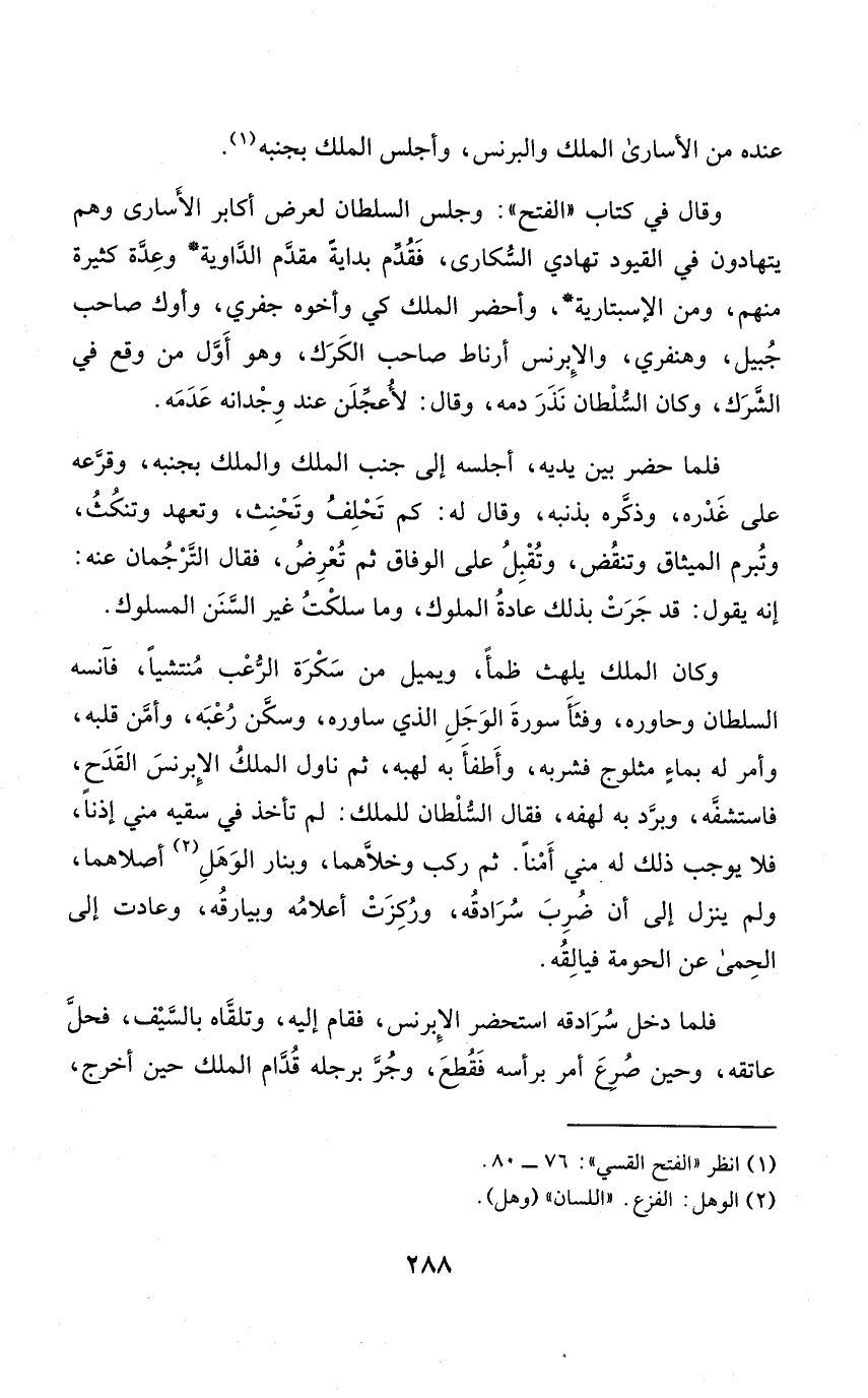 وَقَالَ فِي كتاب الْفَتْح وَجلسَ السُّلْطَان لعرض أكَابِر الْأُسَارَى وهم يتهادون فِي الْقُيُود تهادي السكارى فَقدم بداية مقدم الداوية وعدة كَثِيرَة مِنْهُم وَمن الاسبتارية وأحضر الْملك كي وَأَخُوهُ جفري وأوك صَاحب جبيل وهنفري والإبرنس أرناط صَاحب الكرك وَهُوَ أول من وَقع فِي الشّرك وَكَانَ السُّلْطَان نذر دَمه وَقَالَ لأعجلن عِنْد وجدانه عَدمه