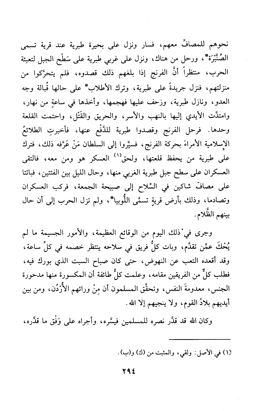 نحوهم للمصاف مَعَهم فَسَار وَنزل على بحيرة طبرية عِنْد قَرْيَة تسمى الصنبرة ورحل من هُنَاكَ وَنزل على غربي طبرية على سطح الْجَبَل لتعبئة الْحَرْب منتظرا أَن الفرنج إِذا بَلغهُمْ ذَلِك قصدوه فَلم يتحركوا من مَنْزِلَتهمْ فَنزل جَرِيدَة على طبرية وَترك الأطلاب على حَالهَا قبالة وَجه الْعَدو ونازل طبرية وزحف عَلَيْهَا فهجمها وَأَخذهَا فِي سَاعَة من نَهَار وامتدت الْأَيْدِي إِلَيْهَا بالنهب والأسر والحريق وَالْقَتْل واحتمت القلعة وَحدهَا