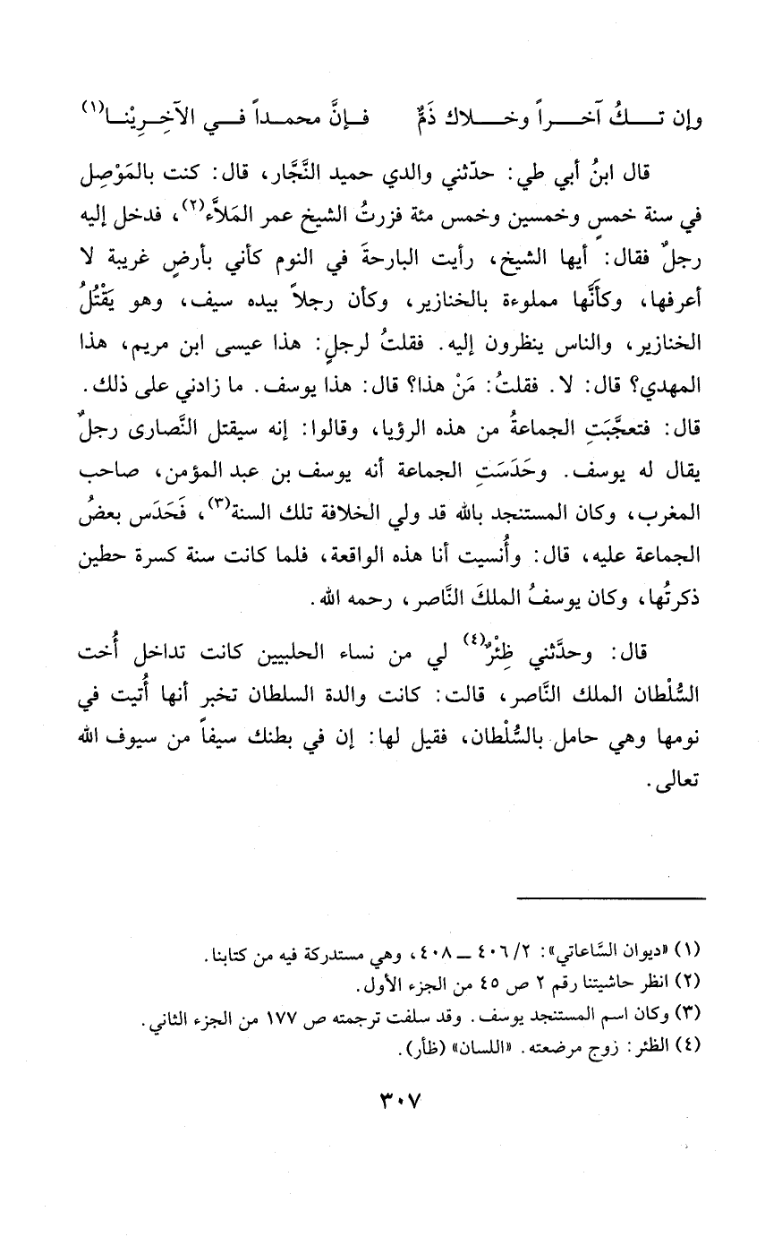 قَالَ وحَدثني ظئر لي من نسَاء الحلبيين كَانَت تدَاخل أُخْت السُّلْطَان الْملك النَّاصِر قَالَت كَانَت وَالِدَة السُّلْطَان تخبر أَنَّهَا أتيت فِي نومها وَهِي حَامِل بالسلطان فَقيل لَهَا إِن فِي بَطْنك سَيْفا من سيوف الله تَعَالَى