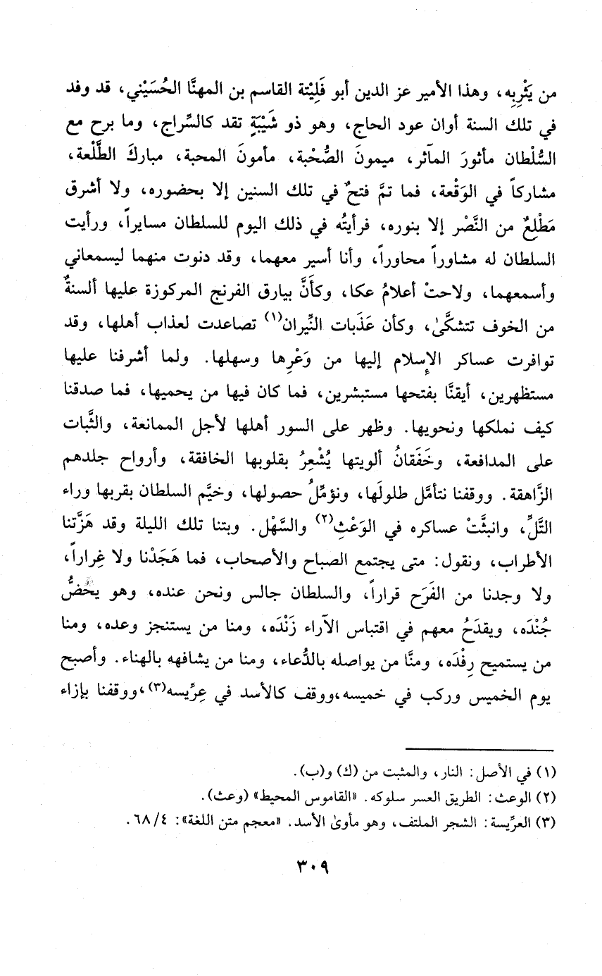 من يثربه وَهَذَا الْأَمِير عز الدّين أَبُو فليتة الْقَاسِم بن المهنا الْحُسَيْنِي قد وَفد فِي تِلْكَ السّنة أَوَان عود الْحَاج وَهُوَ ذُو شيبَة تقد كالسراج وَمَا برح مَعَ السُّلْطَان ماثور المآثر مَيْمُون الصُّحْبَة مَأْمُون الْمحبَّة مبارك الطلعة مشاركا فِي الْوَقْعَة فَمَا تمّ فتح فِي تِلْكَ السنين إِلَّا بِحُضُورِهِ وَلَا أشرق مطلع من النَّصْر إِلَّا بنوره فرأيته فِي ذَلِك الْيَوْم للسُّلْطَان مسايرا وَرَأَيْت السُّلْطَان لَهُ مشاورا محاورا وَأَنا أَسِير مَعَهُمَا وَقد دَنَوْت مِنْهُمَا ليسمعاني وأسمعهما ولاحت أَعْلَام عكا وَكَأن بيارق الفرنج المركوزة عَلَيْهَا أَلْسِنَة من الْخَوْف تتشكى وَكَأن عذبات النيرَان تصاعدت لعذاب أَهلهَا وَقد توافرت عَسَاكِر الْإِسْلَام إِلَيْهَا من وعرها وسهلها