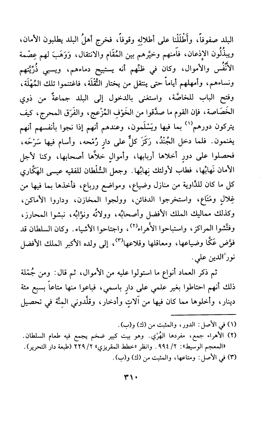وَجعل السُّلْطَان للفقيه عِيسَى الهكاري كل مَا كَانَ للداوية من منَازِل وضياع ومواضع وَربَاع فَأَخذهَا بِمَا فِيهَا من غلال ومتاع وَاسْتَخْرَجُوا الدفائن وولجوا المخازن وداروا الْأَمَاكِن وَكَذَلِكَ مماليك الْملك الْأَفْضَل وَأَصْحَابه وولاته ونوابه نبشوا المحارز وفتشوا المراكز واستباحوا الأهراء واجتاحوا الْأَشْيَاء