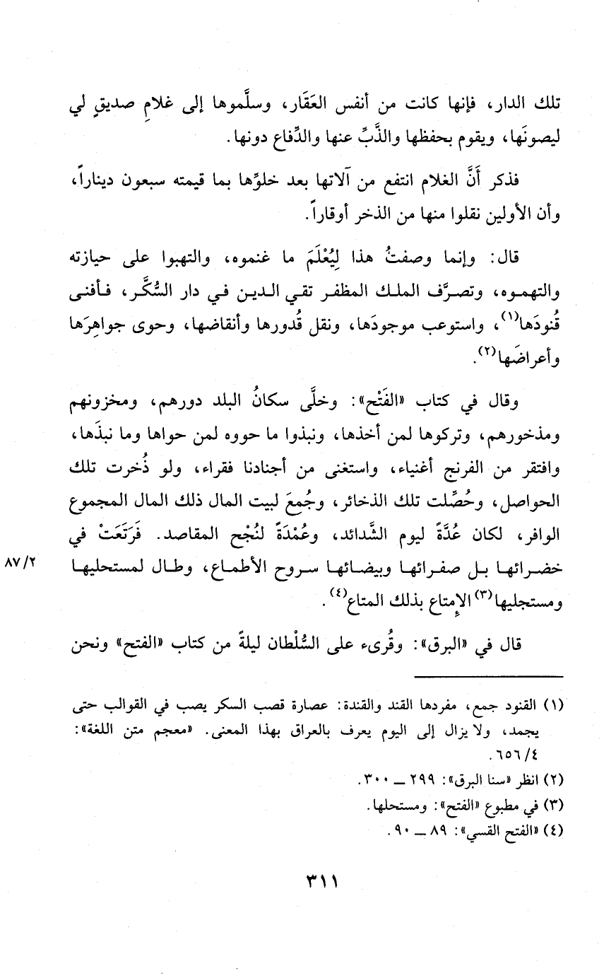 وَقَالَ فِي كتاب الْفَتْح وخلى سكان الْبَلَد دُورهمْ ومخزونهم ومذخورهم وتركوها لمن أَخذهَا ونبذوا مَا حووه لمن حواها وَمَا نبذها وافتقر من الفرنج أَغْنِيَاء وَاسْتغْنى من أجنادنا فُقَرَاء وَلَو ذخرت تِلْكَ الحواصل وحصلت تِلْكَ الذَّخَائِر وَجمع لبيت المَال ذَلِك المَال الْمَجْمُوع الوافر لَكَانَ عدَّة ليَوْم الشدائد وعمدة لنجح الْمَقَاصِد