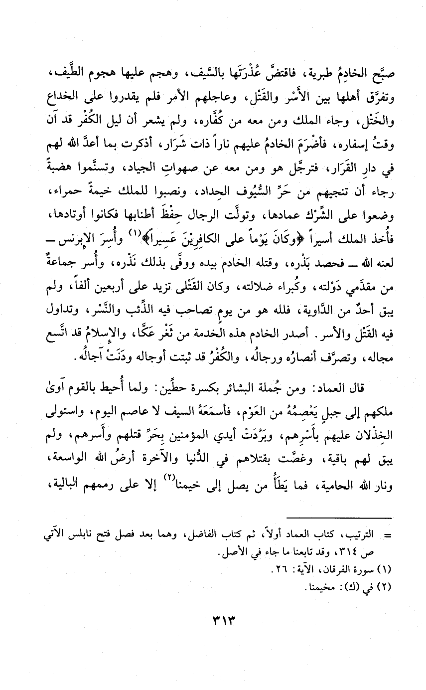 قَالَ الْعِمَاد وَمن جملَة البشائر بكسرة حطين وَلما أحيط بالقوم آوى ملكهم إِلَى جبل يعصمه من العوم فأسمعه السَّيْف لَا عَاصِم الْيَوْم وَاسْتولى الخذلان عَلَيْهِم بأسرهم وَبَردت أَيدي الْمُؤمنِينَ بَحر قَتلهمْ وأسرهم وَلم يبْق لَهُم بَاقِيَة وغصت بقتلاهم فِي الدُّنْيَا وَالْآخِرَة أَرض الله الواسعة ونار الله الحامية فَمَا يطَأ من يصل إِلَى خيمنا إِلَّا على رممهم البالية