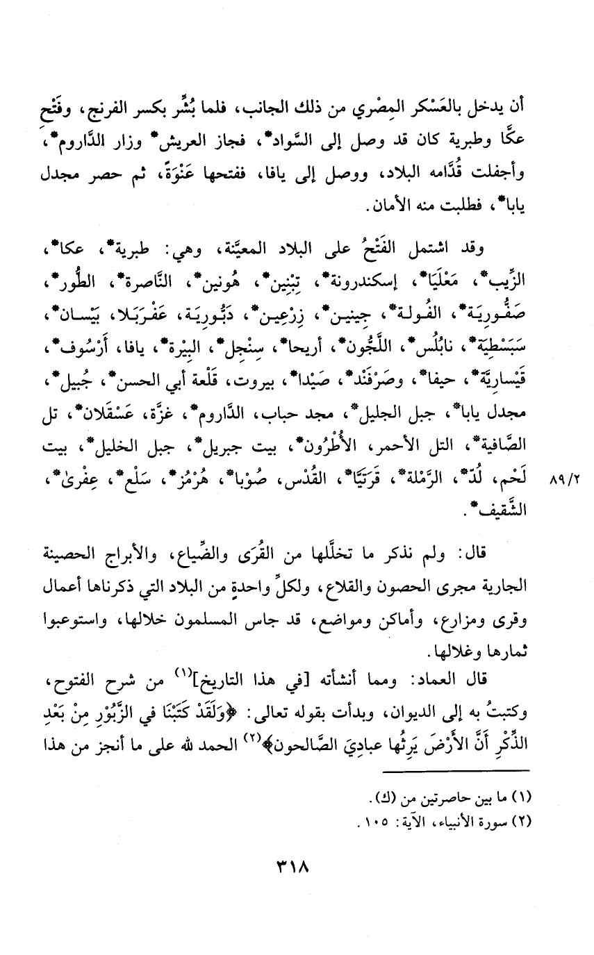 قَالَ الْعِمَاد وَمِمَّا أنشأته فِي هَذَا التَّارِيخ من شرح الْفتُوح وكتبت بِهِ إِلَى الدِّيوَان وبدأت بقوله تَعَالَى {وَلَقَد كتبنَا فِي الزبُور من بعد الذّكر أَن الأَرْض يَرِثهَا عبَادي الصالحون} الْحَمد لله على مَا أنْجز من هَذَا