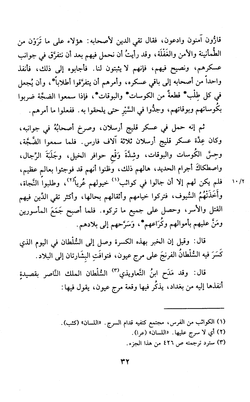 قَالَ وَقيل إِن الْخَبَر بِهَذِهِ الكسرة وصل إِلَى السُّلْطَان فِي الْيَوْم الَّذِي كسر فِيهِ السُّلْطَان الفرنج على مرج عُيُون فتوافت البشارتان إِلَى الْبِلَاد