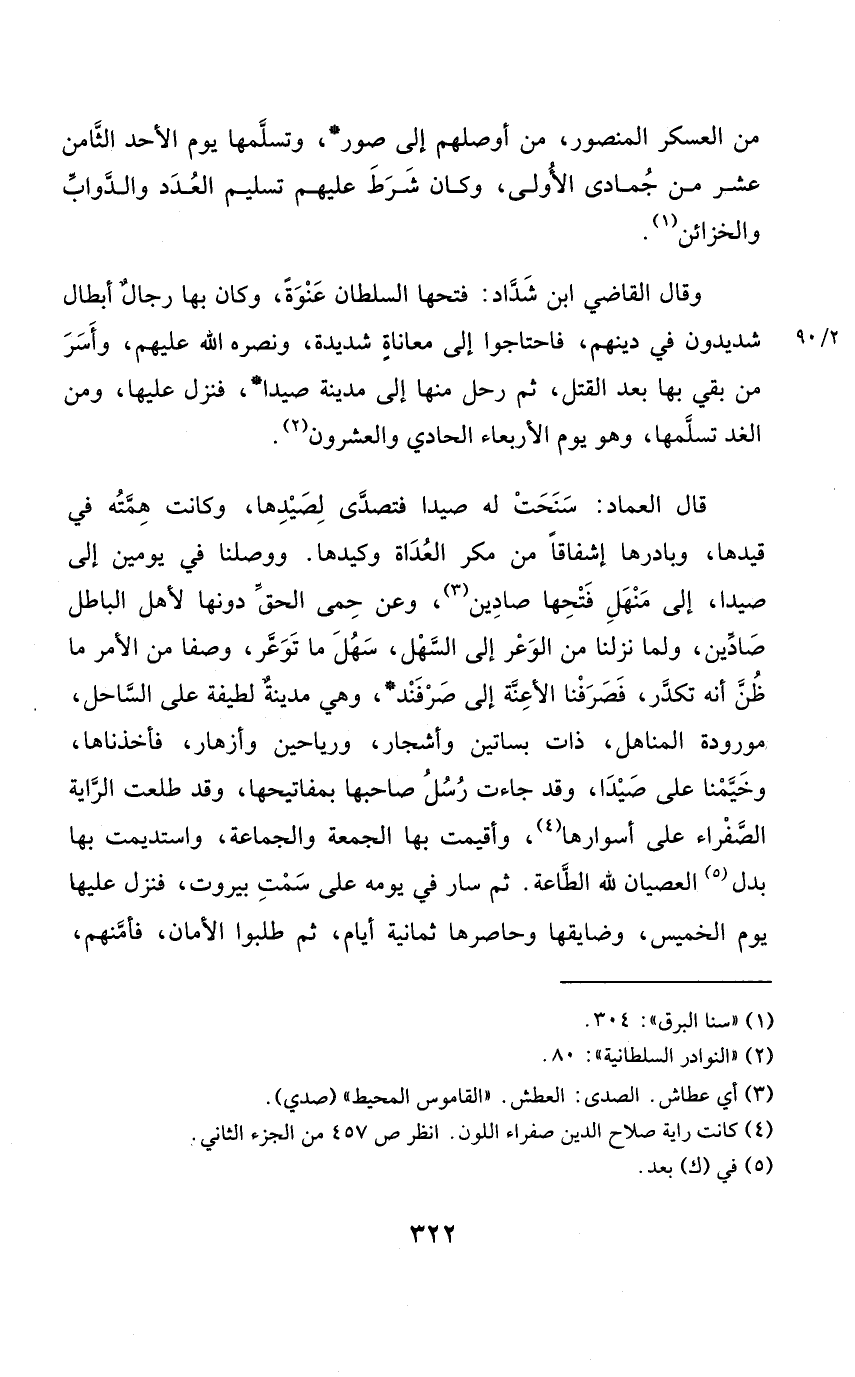 ووصلنا فِي يَوْمَيْنِ إِلَى صيدا إِلَى منهل فتحهَا صادين وَعَن حمى الْحق دونهَا لأهل الْبَاطِل صادين وَلما نزلنَا من الوعر إِلَى السهل سهل مَا توعر وَصفا من الْأَمر مَا ظن أَنه تكدر فصرفنا الأعنة إِلَى صرفند وَهِي مَدِينَة لَطِيفَة على السَّاحِل مورودة المناهل ذَات بساتين وأشجار ورياحين وأزهار فأخذناها وخيمنا على صيدا وَقد جَاءَت رسل صَاحبهَا بمفاتيحها وَقد طلعت الرَّايَة الصَّفْرَاء على أسوارها وأقيمت بهَا الْجُمُعَة وَالْجَمَاعَة واستديمت بهَا بدل الْعِصْيَان لله الطَّاعَة
