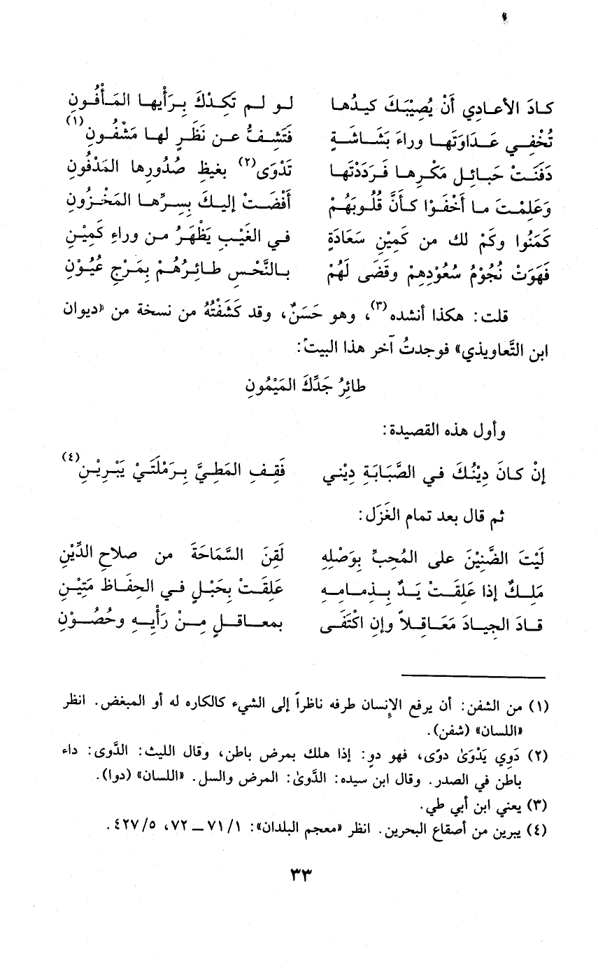 قلت هَكَذَا أنْشدهُ وَهُوَ حسن وَقد كشفته من نُسْخَة من ديوَان ابْن التعاويذي فَوجدت آخر هَذَا الْبَيْت