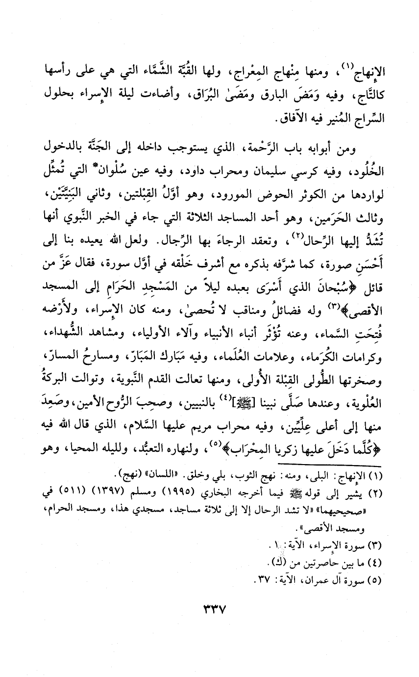 وَلَعَلَّ الله يُعِيدهُ بِنَا إِلَى أحسن صُورَة كَمَا شرفه بِذكرِهِ مَعَ أشرف خلقه فِي أول سُورَة فَقَالَ عز من قَائِل {سُبْحَانَ الَّذِي أسرى بِعَبْدِهِ لَيْلًا من الْمَسْجِد الْحَرَام إِلَى الْمَسْجِد الْأَقْصَى} وَله فَضَائِل ومناقب لَا تحصى وَمِنْه كَانَ الْإِسْرَاء ولأرضه فتحت السَّمَاء وَعنهُ تُؤثر أنباء الْأَنْبِيَاء وآلاء الْأَوْلِيَاء ومشاهد الشُّهَدَاء وكرامات الكرماء وعلامات الْعلمَاء وَفِيه مبارك المبار ومسارح المسار وصخرتها الطُّولى الْقبْلَة الأولى وَمِنْهَا تعالت الْقدَم النَّبَوِيَّة وتوالت الْبركَة العلوية وَعِنْدهَا صلى نَبينَا صلى الله عَلَيْهِ وَسلم بالنبيين وَصَحب الرّوح الْأمين وَصعد مِنْهَا إِلَى أَعلَى عليين وَفِيه محراب مَرْيَم عَلَيْهَا السَّلَام الَّذِي قَالَ الله فِيهِ {كلما دخل عَلَيْهَا زَكَرِيَّا الْمِحْرَاب} ولنهاره التَّعَبُّد ولليله الْمحيا وَهُوَ