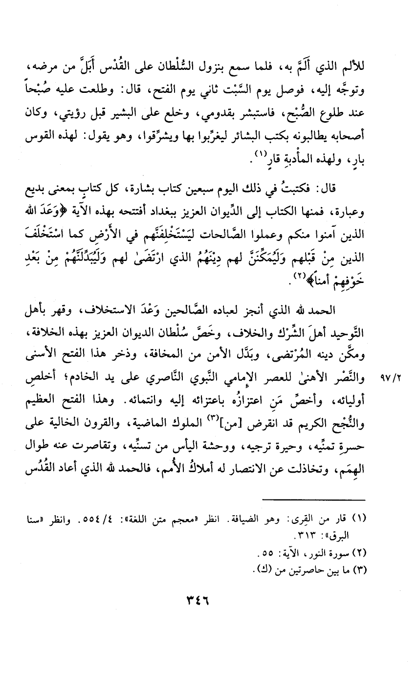 وَهَذَا الْفَتْح الْعَظِيم والنجح الْكَرِيم قد انقرض من الْمُلُوك الْمَاضِيَة والقرون الخالية على حسرة تمنيه وحيرة ترجيه ووحشة الْيَأْس من تسنيه وتقاصرت عَنهُ طوال الهمم وتخاذلت عَن الِانْتِصَار لَهُ أَمْلَاك الْأُمَم فَالْحَمْد لله الَّذِي أعَاد الْقُدس